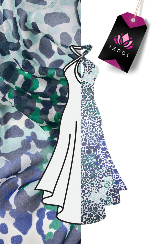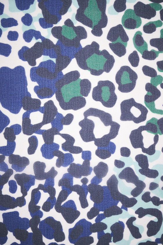 Italiensk chiffong 100% siden i grått och grönt med ett kornblått leopardmönster motiv med gröna accenter. Sidenchiffong är ett tunt, transparent, matt, lätt och luftigt tyg. Perfekt för att sy en klänning, blus, kjol eller sjal.
