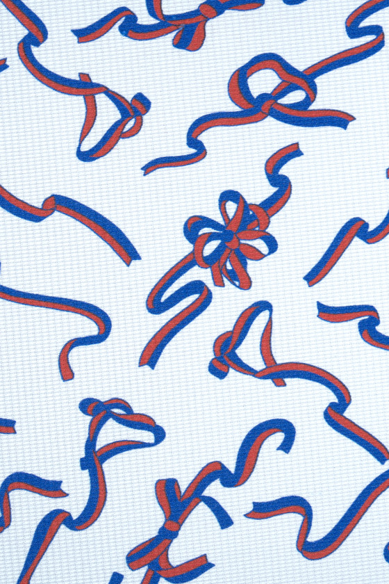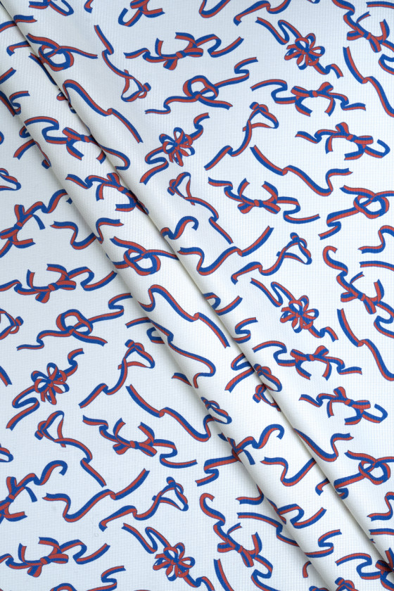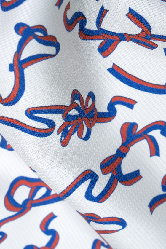 Italienskt 100% sidentyg i krämfärg med bandmotiv. Tyget är något tjockare, har en fin jacquardstruktur och en delikat glans som är karakteristisk för sidentyger. Mönstret är tätt med en oregelbunden form i blått och rött, det finns i kollektionen från det välkända italienska modehuset. Det är ett fantastiskt förslag för att sy en lätt blus eller klänning. Om du gillar ädla tyger och märkesmönster i moderiktiga färger är det här tyget just för dig.