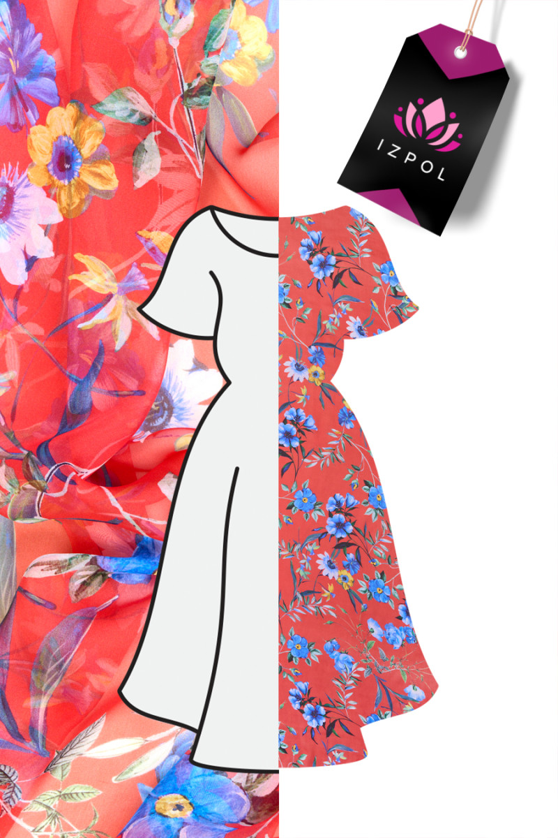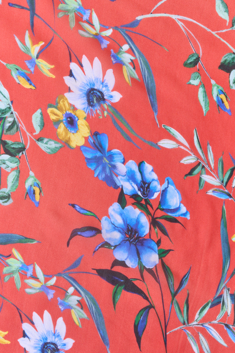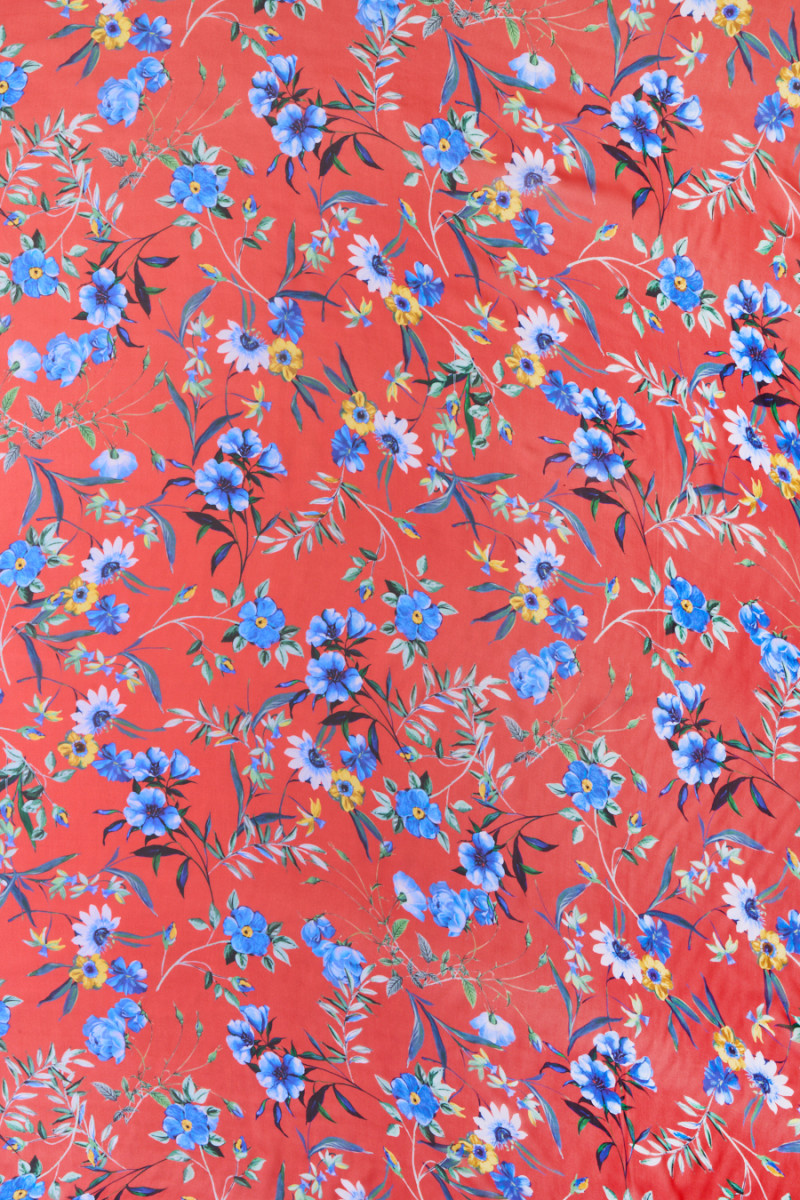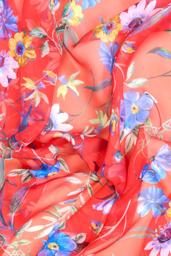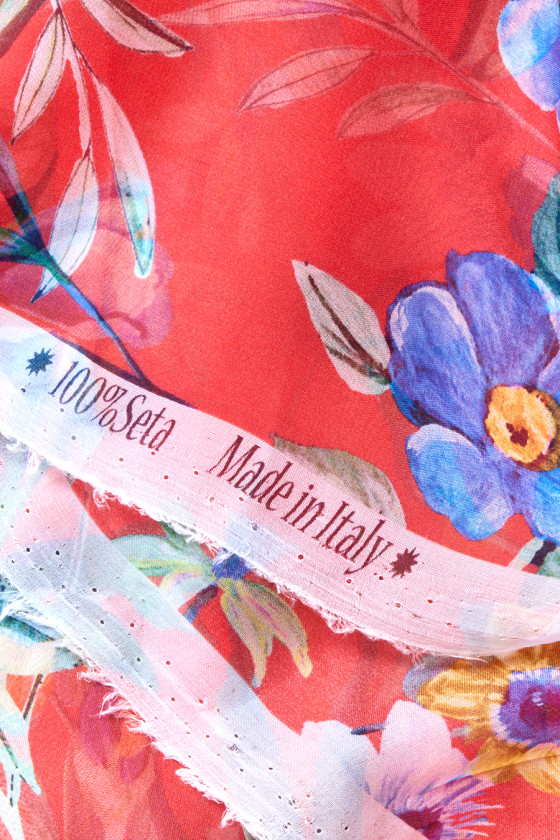 Italiensk 100% sidenmuslin med ett motiv av blå, gula och gräddvita blommor på en röd bakgrund, helheten kompletteras av blad och stjälkar i dämpade nyanser av grönt. Naturlig sidenmuslin är ett mycket känsligt, luftigt, transparent tyg med en delikat glans som är karakteristisk för sidentyger. Perfekt för lätta klänningar, blusar eller kjolar.
