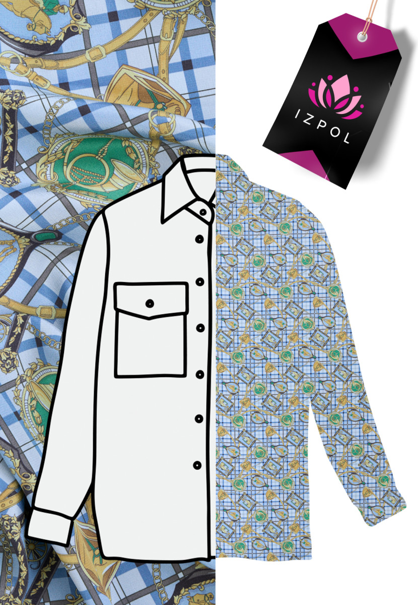 Italiensk 100% sidencrepe med ryttarmotiv på blå botten. Det täta ryttarmönstret visar regelbundet placerade bilder av häst, vagn, trumpet och ryttare i dekorativa ramar som sträcker sig från 5 cm till 7 cm. Bakgrunden på tyget med ett rutigt tryck är dessutom fylld med ränder och kedjor i guldfärg. Ett intressant förslag för fans av märkeskläder, eftersom det kommer från en samling av en välkänd modedesigner. Tyget är lätt, böljande, tunt men täckande, perfekt för att sy en luftig klänning, kjol eller blus.
