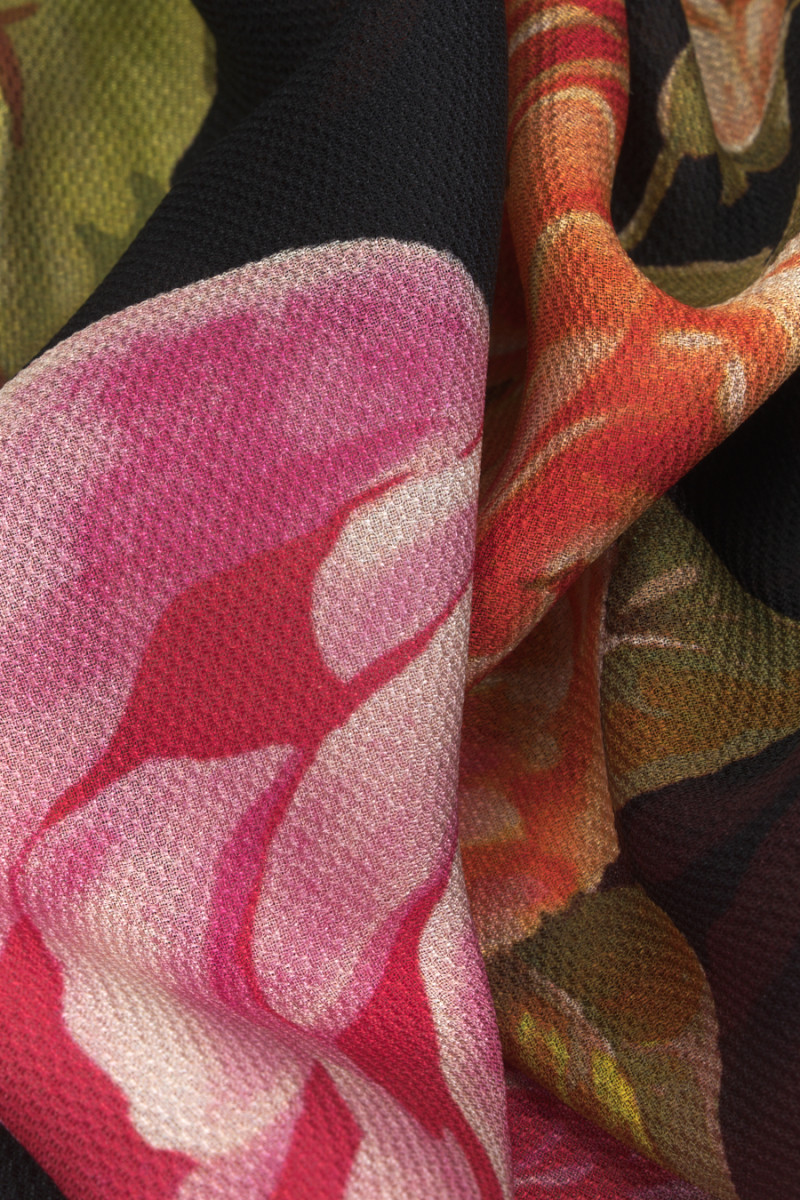 Italienskt 100% sidentyg i svart färg, med ett tätt mönster av stora rosor i rött, orange, rosa och gult. Ett tyg med en intressant väv som liknar ett nät, avslutat med en subtil glans. Det är ljust, luftigt, transparent och vackert draperat. Färgglada blommor som varierar i storlek från 9 cm till 24 cm. Ett vackert förslag från vilket du kan trolla fram klänningar, kjolar eller blusar.