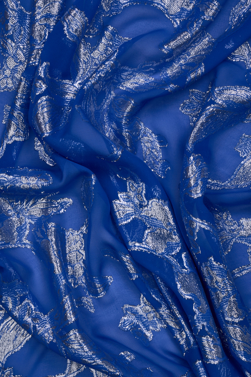 Italienskt blåklintsblått sidentyg med broderade blommor av silver, glänsande tråd. Georgette vävt tyg, tunt, transparent, mycket lätt, icke-elastiskt. Ett vackert förslag från vilket du kan skapa en unik, luftig klänning, såväl som en blus, kjol eller tunika.