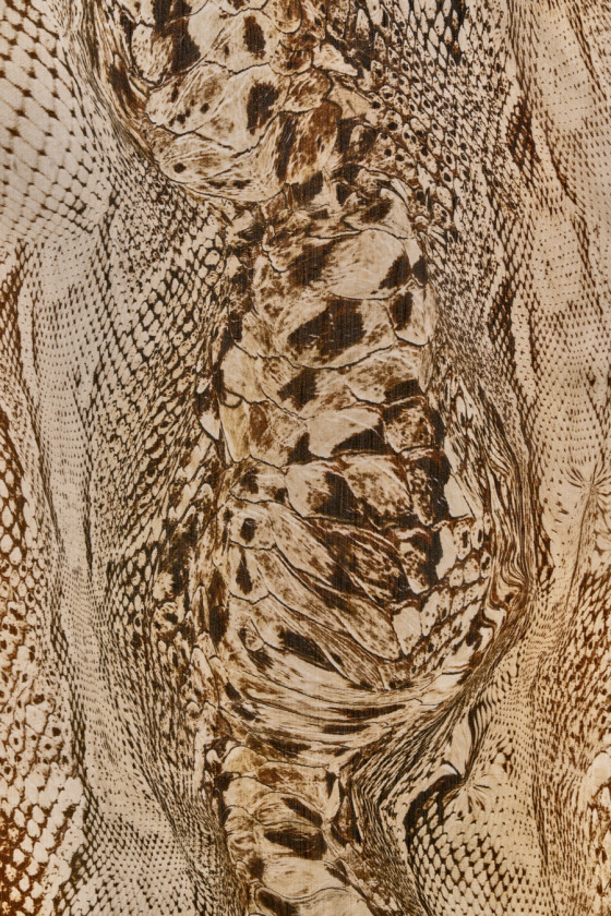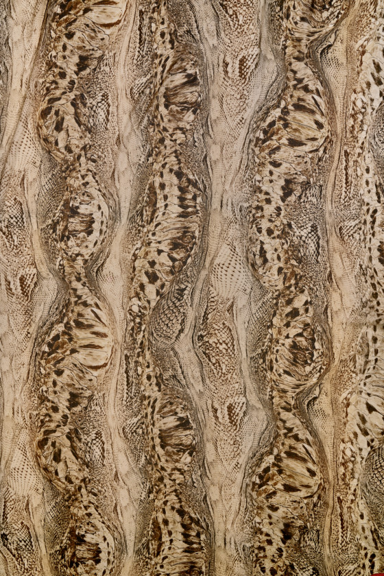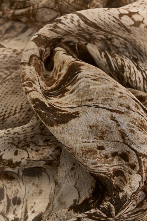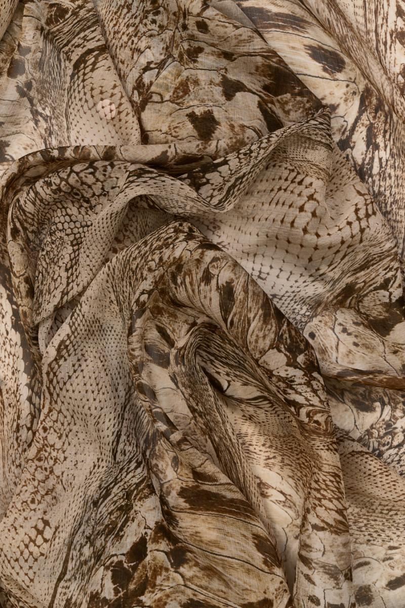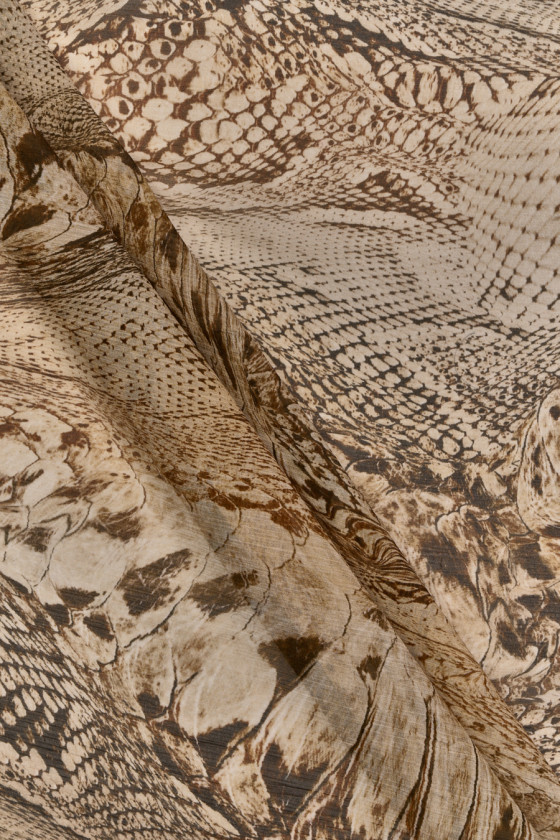 Italiensk chiffong 100% siden med ormskinnsmotiv i nyanser av beige och brunt. Ett mycket intressant, ganska stort djurmönster gjort i dämpade färger. Tyget är mycket lätt, luftigt, transparent och icke-elastiskt. Ett idealiskt förslag för fans som uppskattar lugn men ändå originell design. Vi rekommenderar den till luftiga klänningar, kjolar och blusar, t.ex. med volanger.