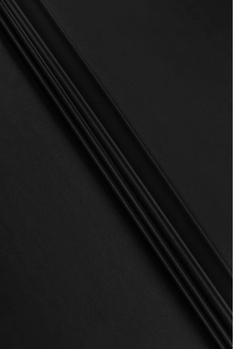 Italiensk satin av hertuginnans typ i svart. Materialet vävs av acetat, ull och naturliga sidentrådar. Vackert blank, oflexibel och styv. Den är perfekt för att sy en elegant klänning, kjol eller kappa.