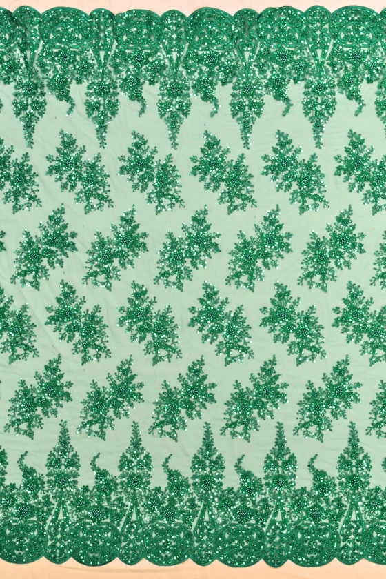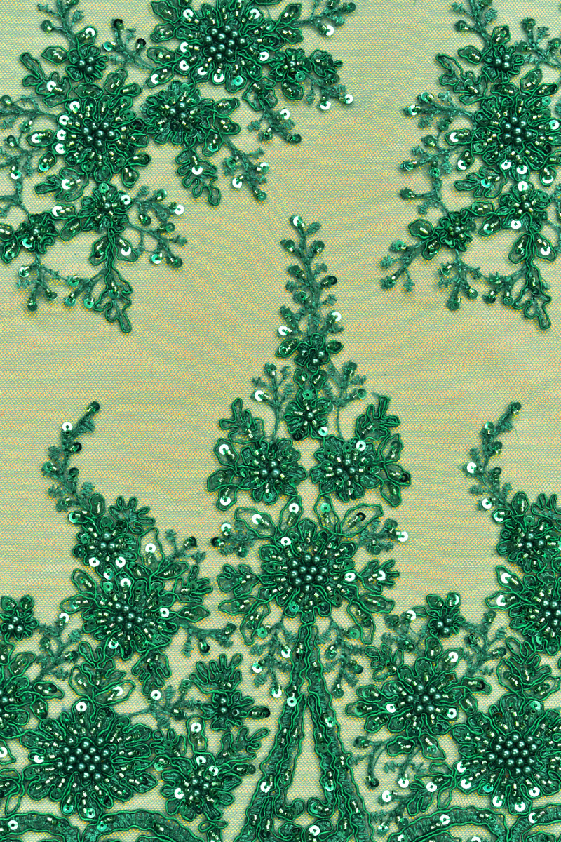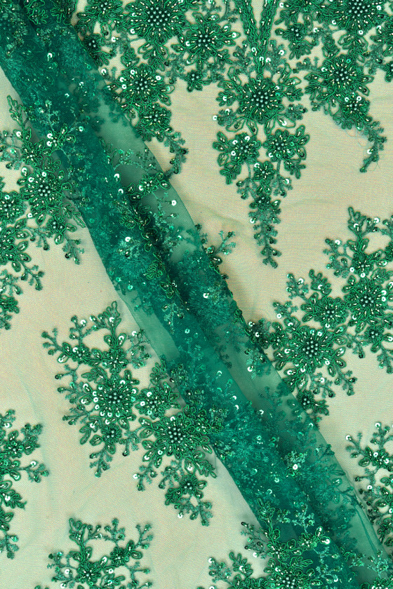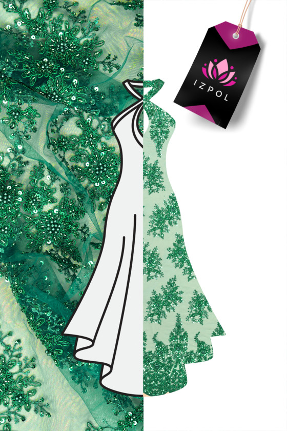 Italienskt spetsaftontyg i grönt, tillverkat av tyll i samma färg med jämnt broderade blommotiv med en storlek på 10 cm*20 cm. Den är rikt dekorerad med gröna paljetter, pärlor och pärlor och kantad med ett grönt snöre som gör mönstret något konvext. Tygets kanter avslutas med en bred, dekorativ tand - vi syr den omkrets.