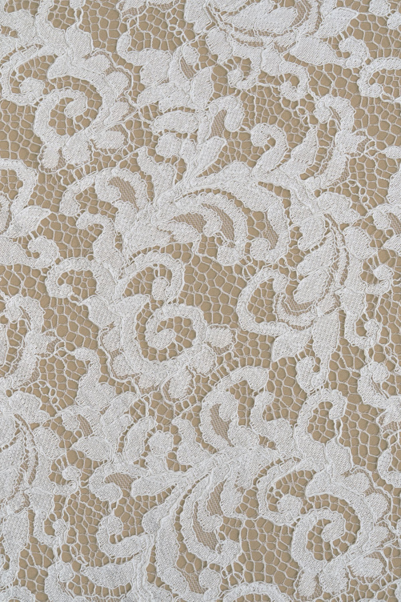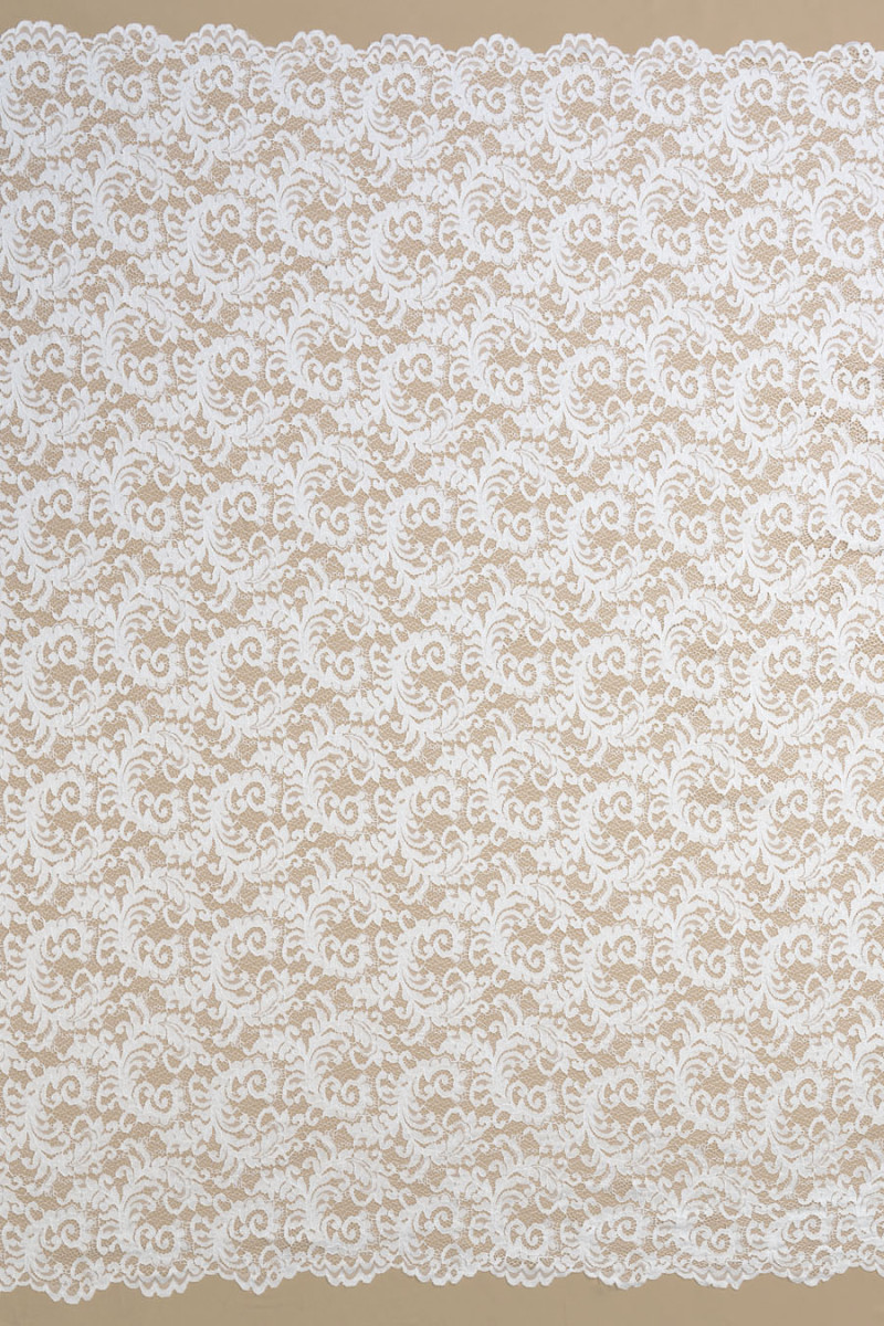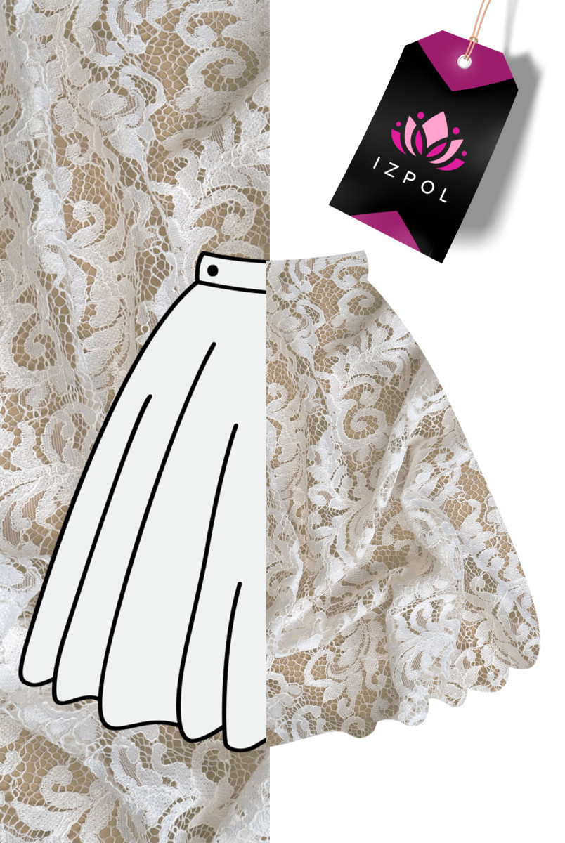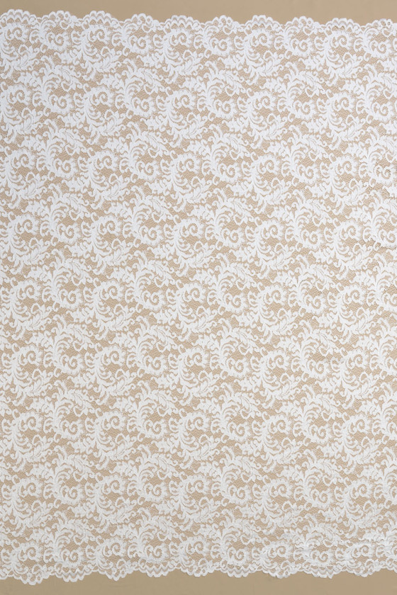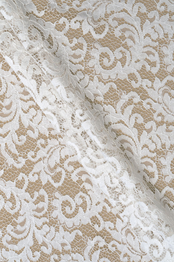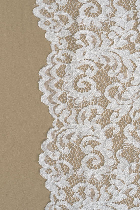 Italiensk spets i cremefärg. Tyget har ett tätt blommotiv som är sammankopplat med nät och avslutas med ett snöre. Kronan avslutas med en dekorativ tand på båda sidor - vi syr den omkrets. Ett mycket trevligt förslag för människor som gillar ljusa men inte vita färger.