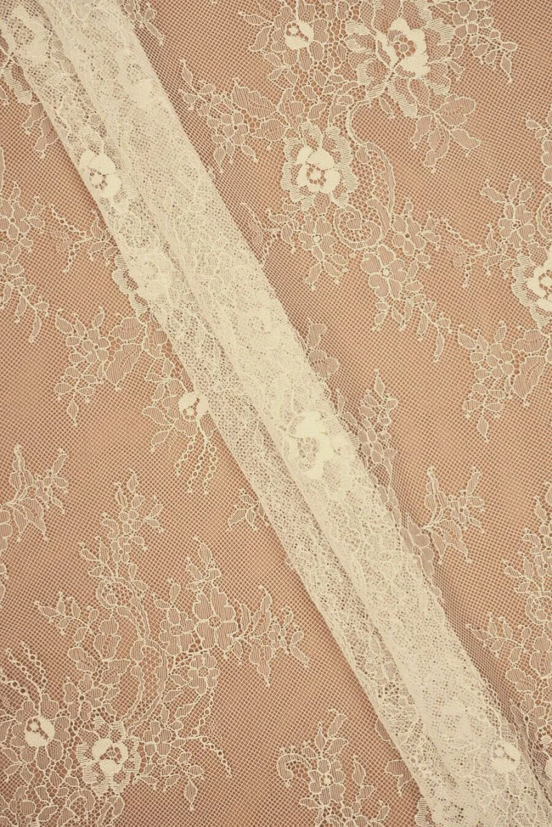 Italiensk, delikat fransk spets i vaniljfärg med ett tätt motiv av rosenblommor omgivna av blad. Kronan är mjuk, arbetar på fibrer och avslutas med en dekorativ tand på båda sidor. Den är perfekt för att sy en klänning, blus, eleganta underkläder och som dekorativt element i kläder.