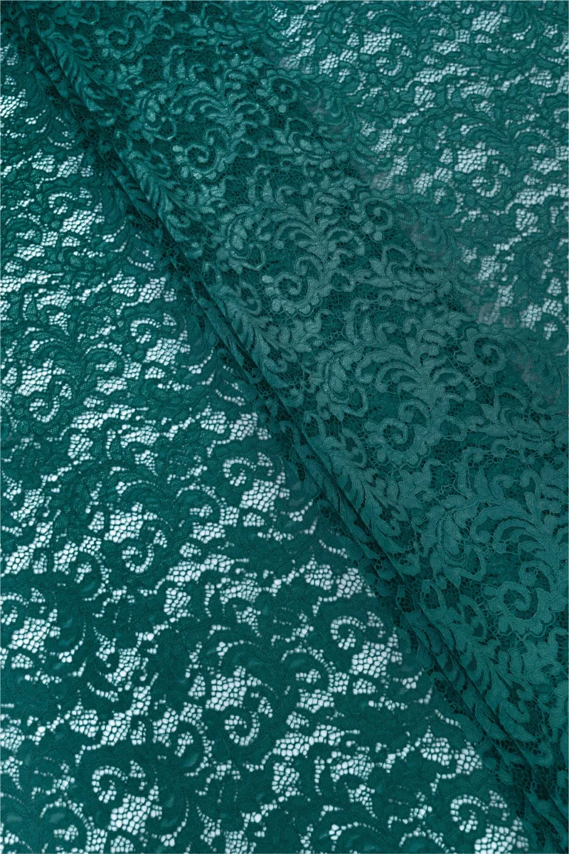 Italiensk spets i marinblått. Tyget har ett tätt blommönster som är förbundet med nät och avslutas med en band. Kronan på båda sidor är avslutad med en dekorativ tand – vi syr den runt omkretsen. Den är mjuk, transparent och oflexibel. Ett mycket trevligt förslag där du kan skapa klänningar, kjolar, blusar eller högtidsshorts.