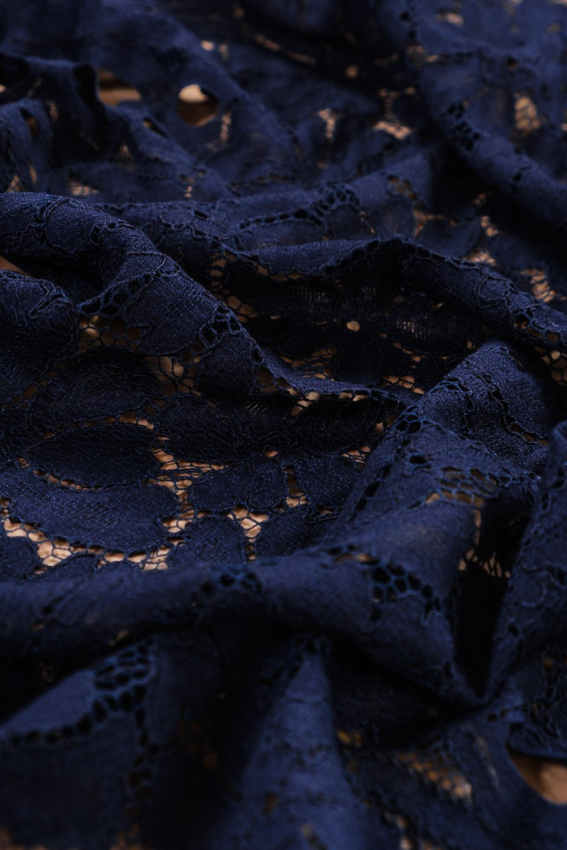 Vacker, marinblå spets av medeltjocklek med ett ovanligt mönsterarrangemang. Vi rekommenderar att du syr den runt omkretsen.