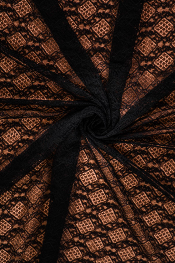 Delikat spets i svart med ett mycket intressant, tätt, geometriskt mönster. Kronan är flexibel - den är inte färdig med en dekorativ tand. Tyget är 90 cm brett. Perfekt för blusar och klänningar.