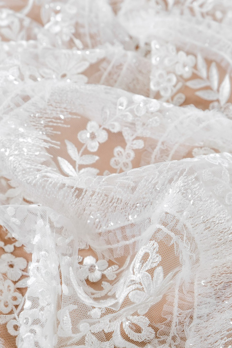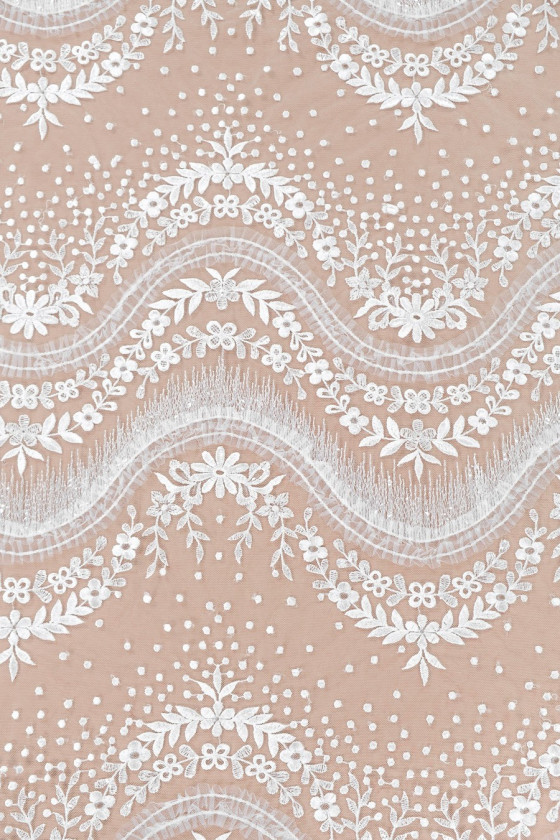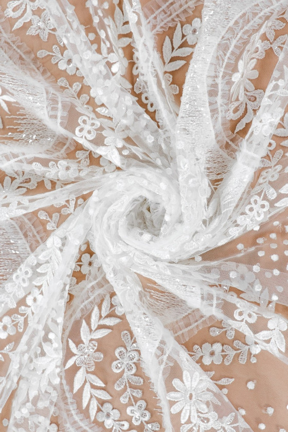 Vacker benvit bröllopsspets avslutad med en tand på båda sidor. Tanden är ca 15 cm bred. Broderad med pärlor och paljetter. Tyget är perfekt för bröllopsklänningar och blusar.