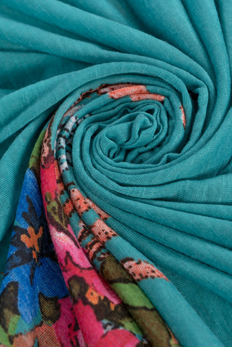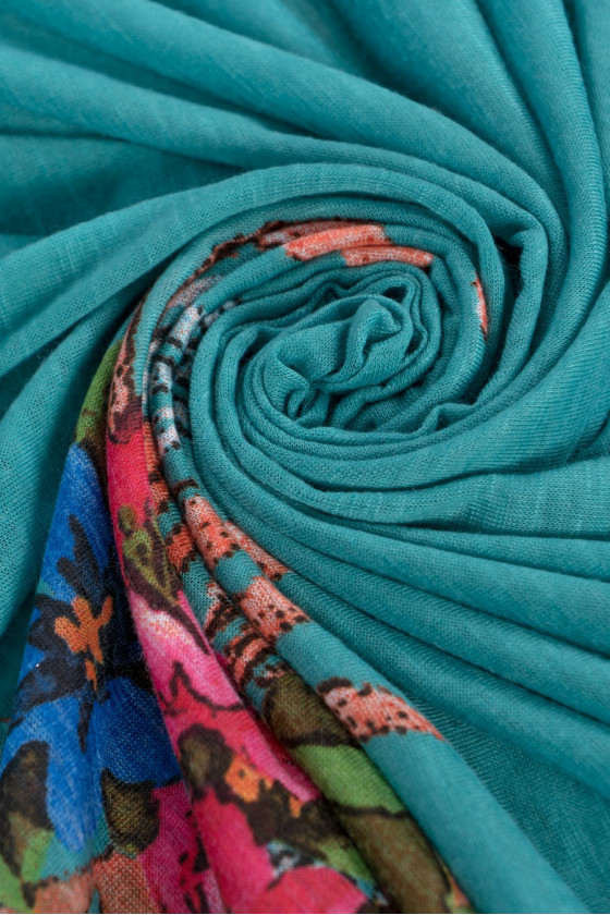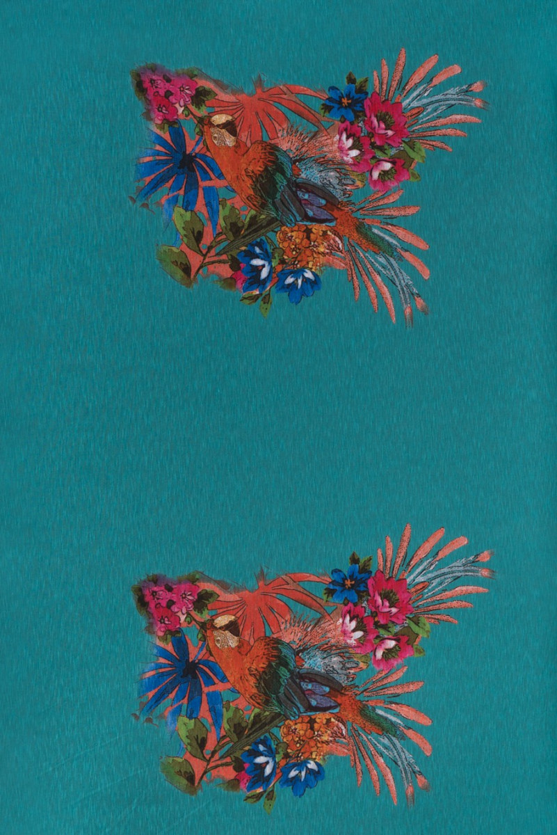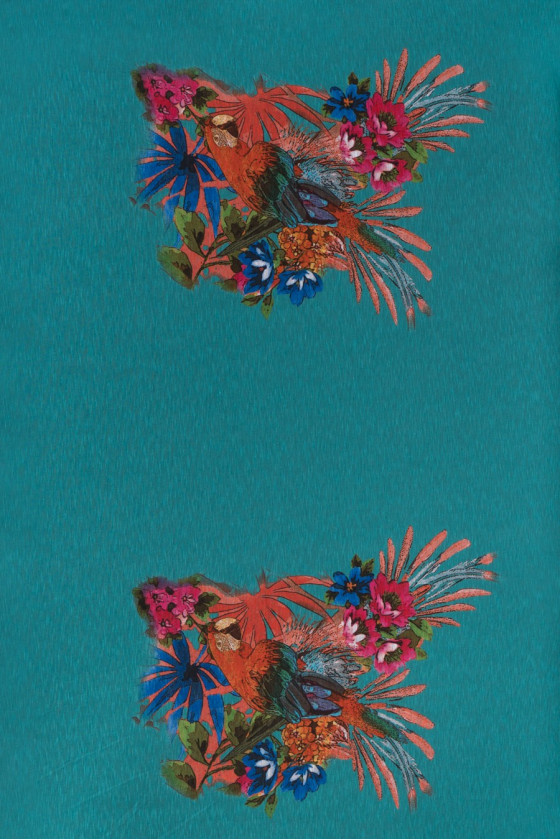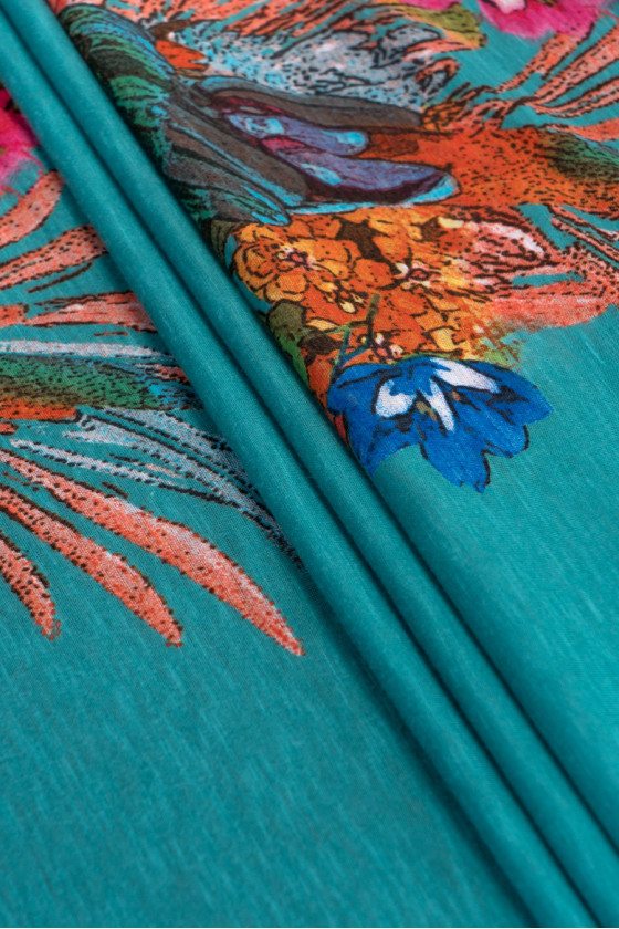 Vackert italienskt viskosstickat tyg med ett papegojmönster omgivet av blommor. Färger: grön turkos, orange, rosa, grön. Elastiskt tyg, finns i en kupong med måtten 70*140 cm.