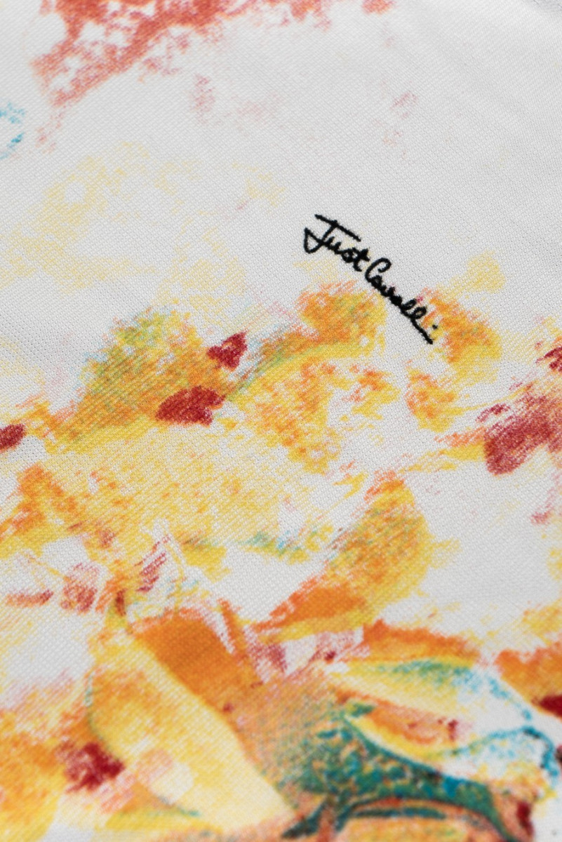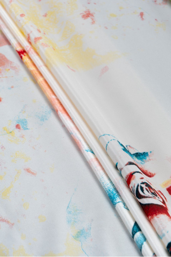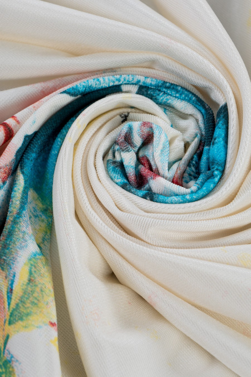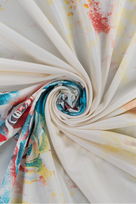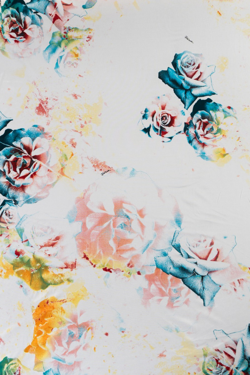 Italiensk viskosjerseystickat tyg i écru-färg med ett motiv av rosblommor i olika storlekar i rosa, orange, blått och grönt. Mönstret är något suddigt, vilket gör det mer delikat och subtilt, plus att det är signerat med namnet på en välkänd modedesigner. Tyget har en något grov struktur, är elastiskt och något svalkande (kallt). Ett fanatiskt förslag för att sy en klänning eller tröja för fans av märkestyger.