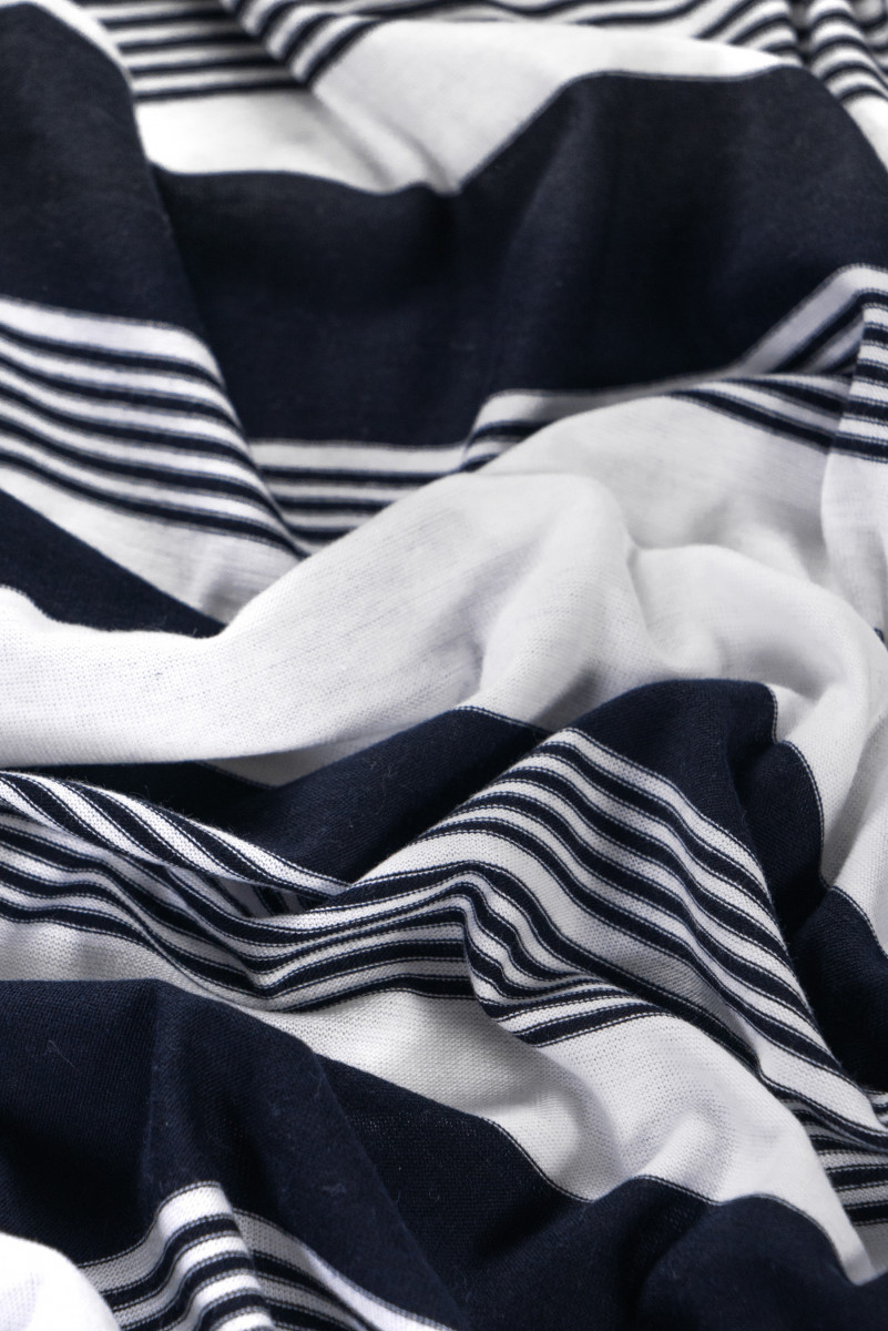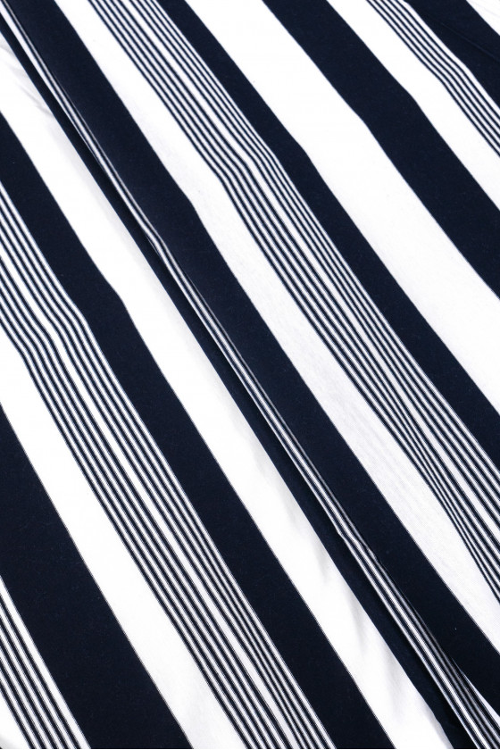 Italienskt viskosstickat tyg med asymmetriska ränder i svart och creme. Viskosstickat tyg är ett naturligt tyg (erhållet från cellulosa), mycket mjukt och luftigt. Tyget är perfekt för att sy en sommarklänning, blus eller kjol.
