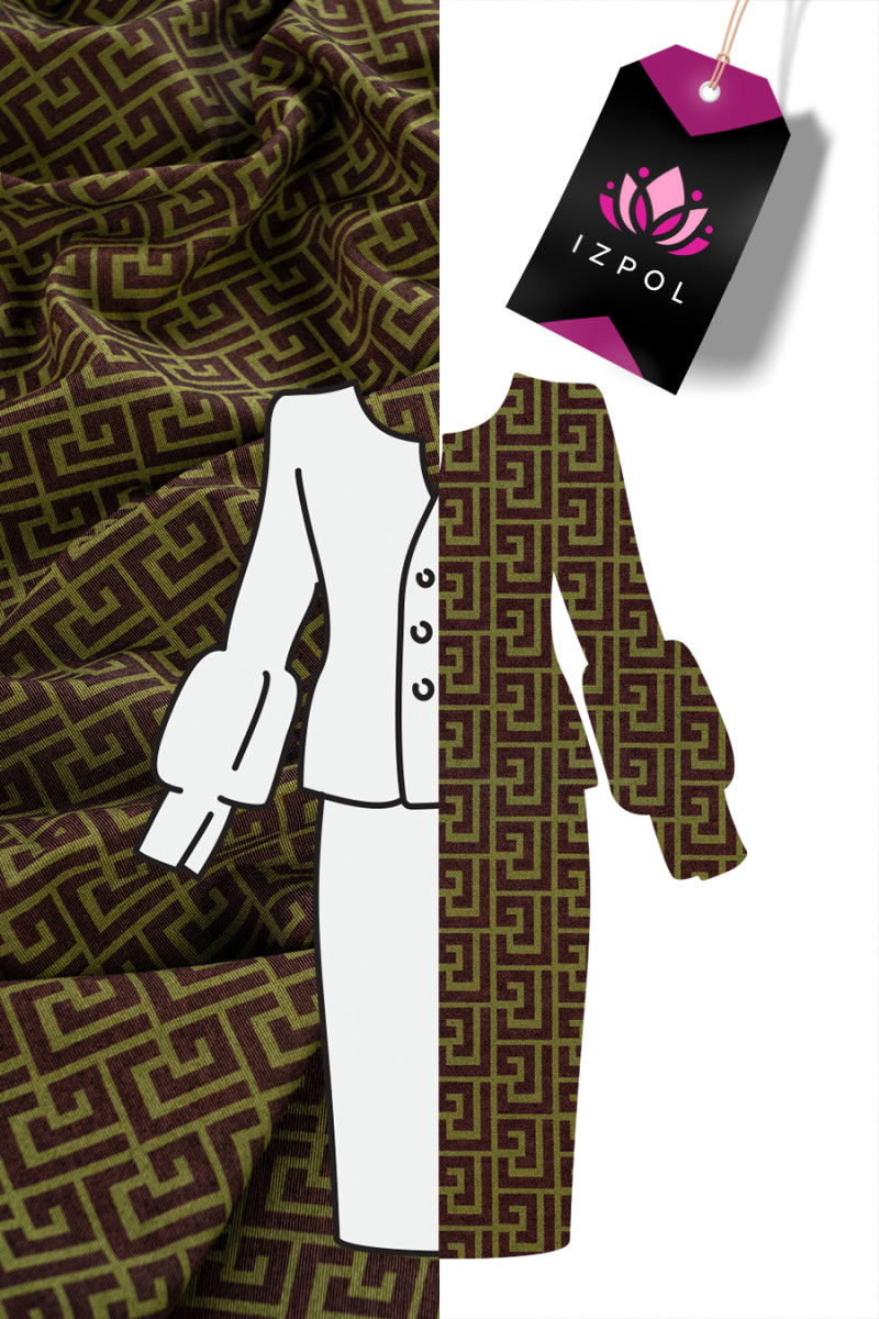 Italiensk viskosjersey stickat tyg i oliv och brunt - signerat med logotypen för det välkända franska modehuset. Jersey är ett köttigt, ogenomskinligt, mjukt draperat stickat tyg som kan sys ofodrat. Den är perfekt för vardagsklänningar, kjolar, jackor. Vi rekommenderar att du krymper innan du syr.