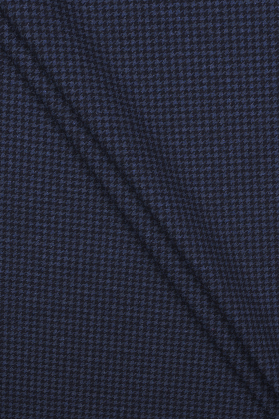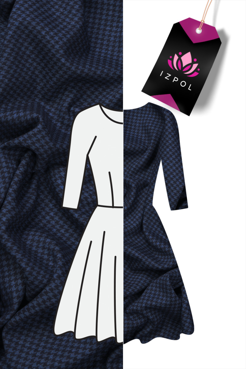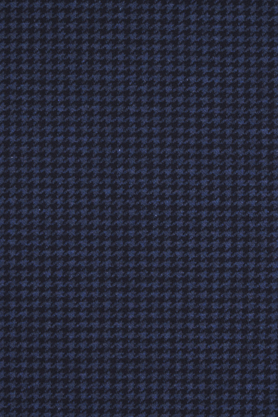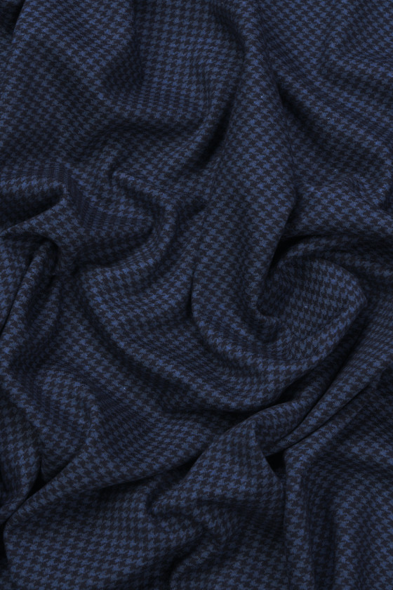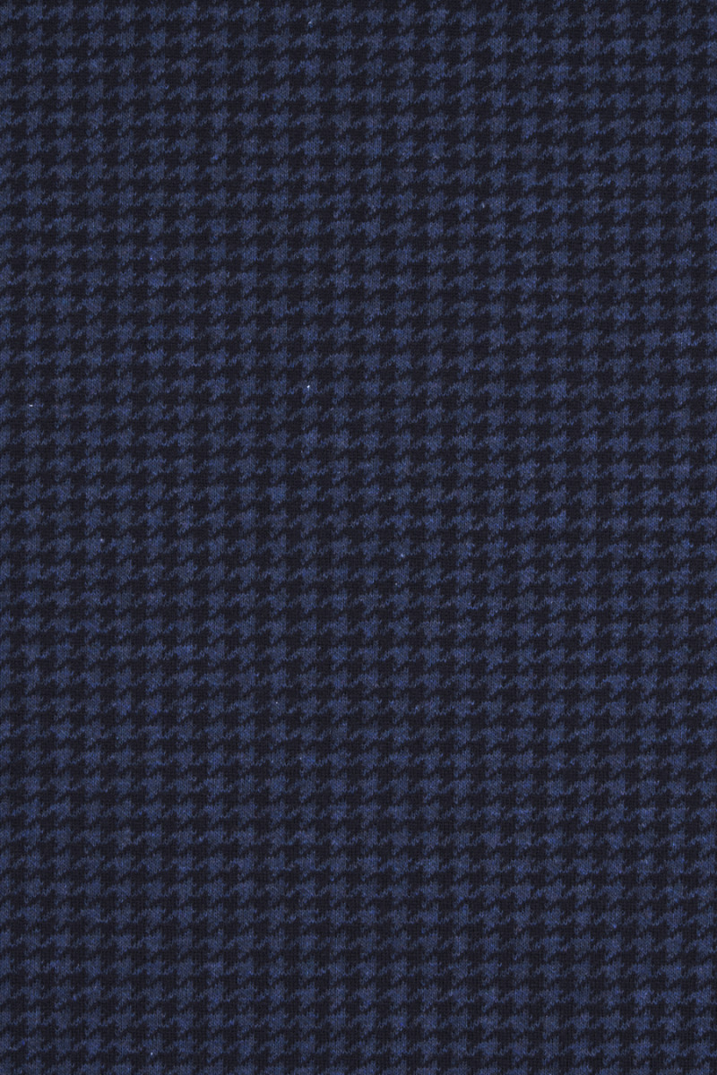 Italienskt jerseystickat tyg 100% ull med ett svart och marinblått kycklingfotsmotiv (0,5 cm). Jerseytyg är ett täckande, mjukt draperat stickat tyg som kan sys ofodrat.