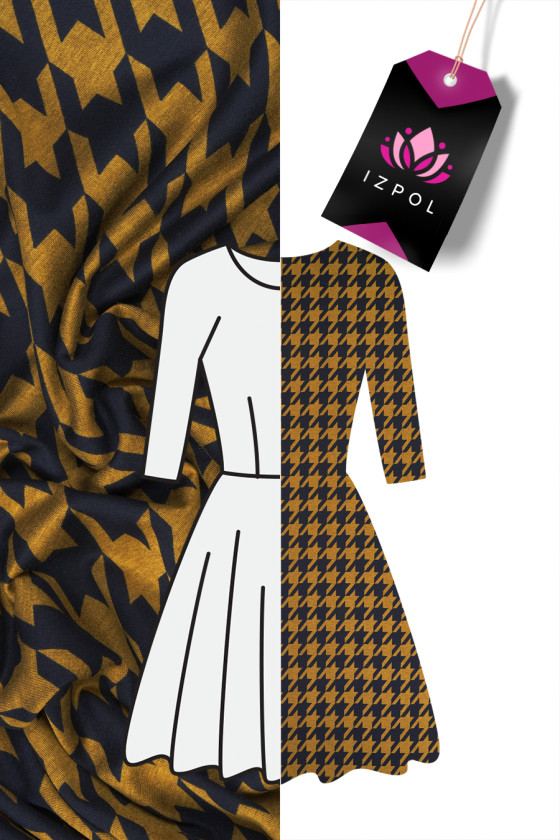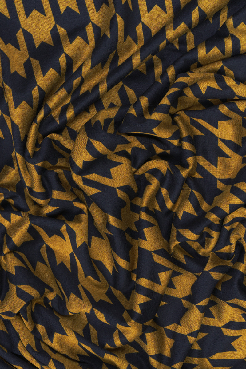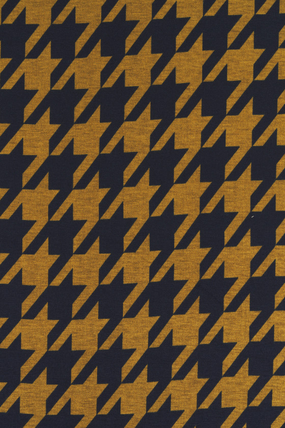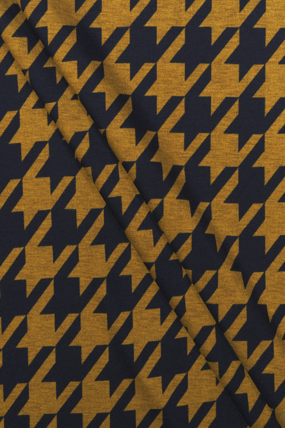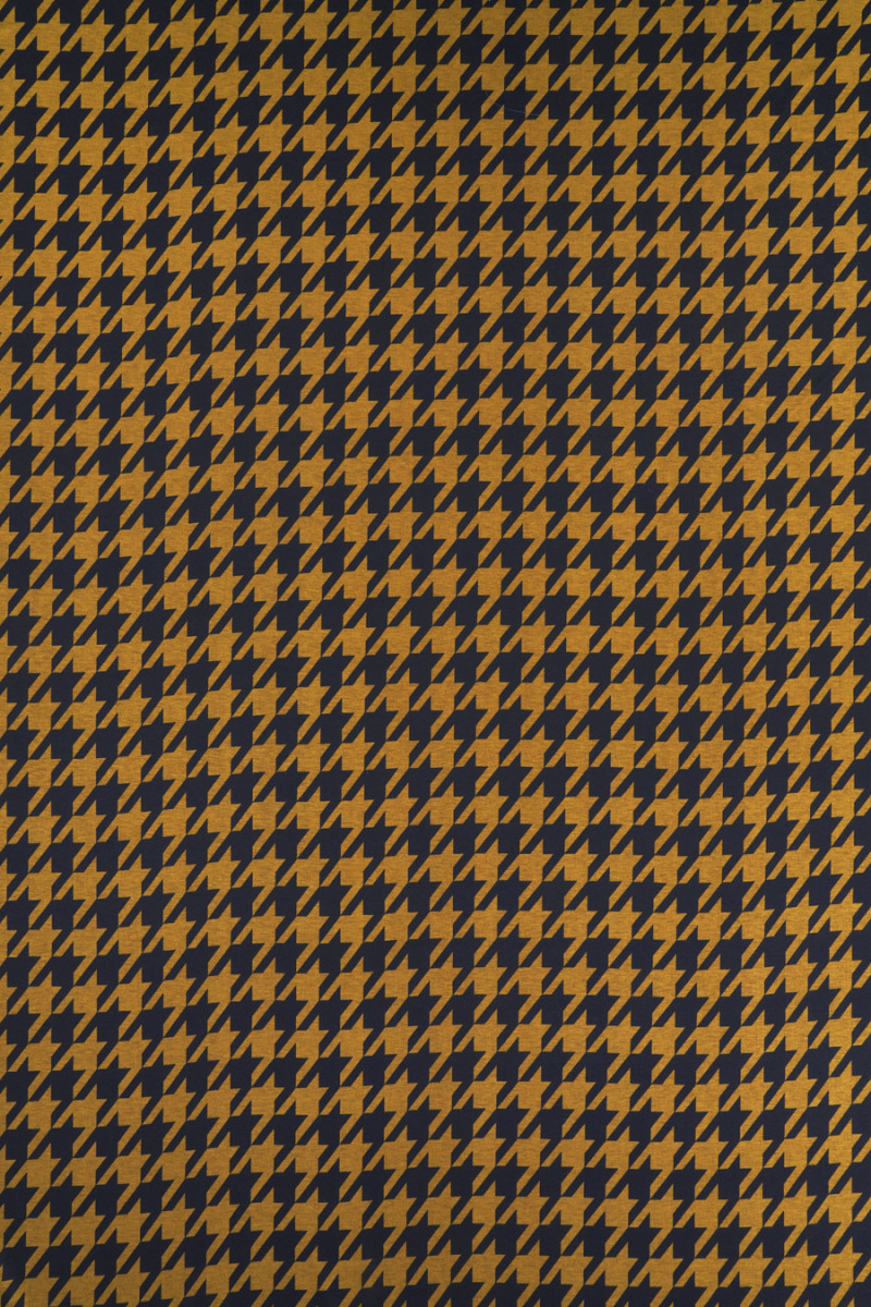 Italiensk trikå med stort kycklingfotsmotiv (7 cm) i senap och svart. Jerseystickat tyg är ett överdragstyg med tät väv, elastisk, mjukt draperad, som kan sys ofodrad.
