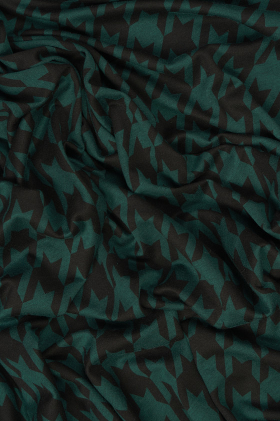 Italiensk jerseystickat tyg med ett stort kycklingfotsmotiv (7 cm) i buteljgrönt och svart. Jerseystickat tyg är ett överdragstyg med tät väv, elastisk, mjukt draperad, som kan sys ofodrad. Den är perfekt för vardagsklänningar.