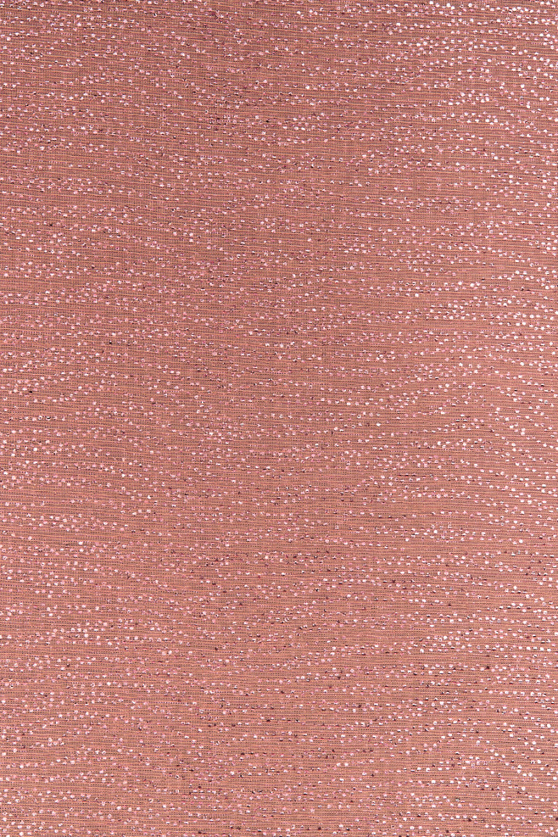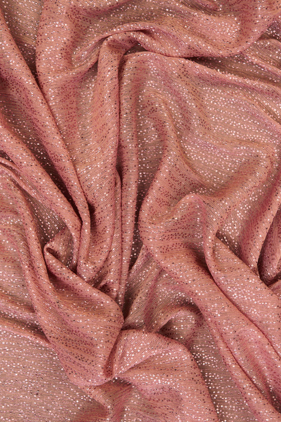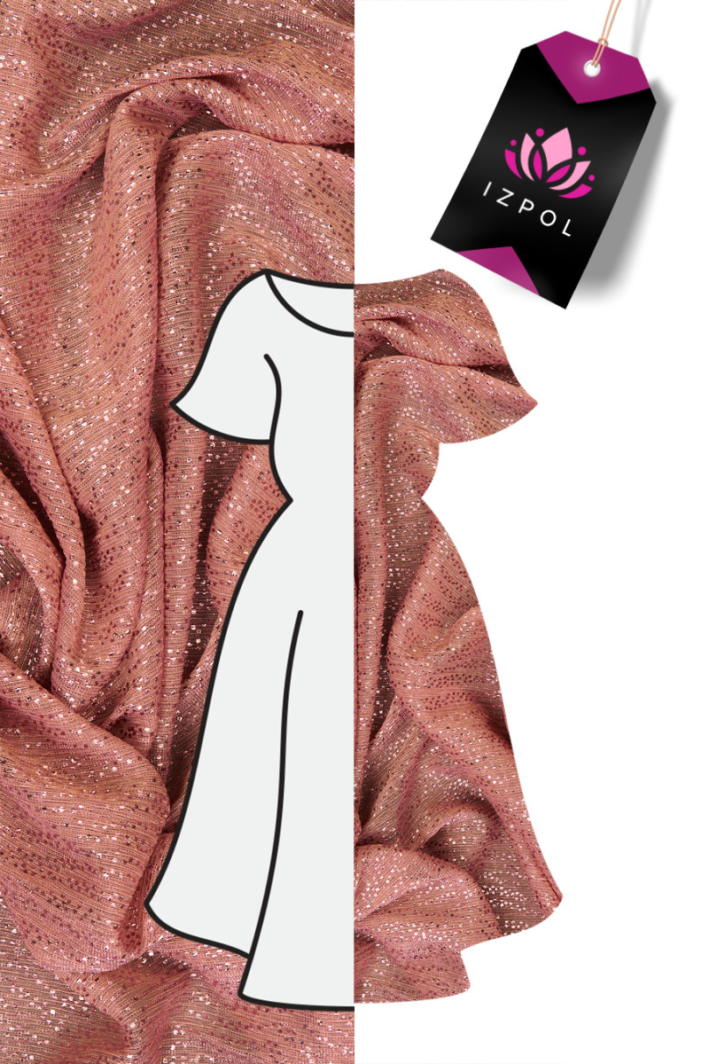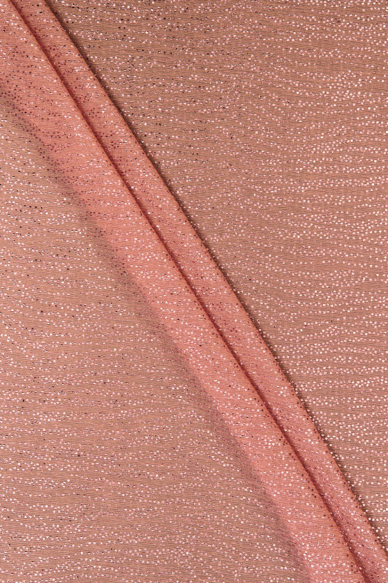 Italienskt laxfärgat stickat tyg dekorerat med glänsande glitter. Det stickade tyget är mycket tunt, transparent och mjukt draperat. Dess ytterligare fördel är det faktum att den är flexibel i båda riktningarna. Den är perfekt för att sy en aftonblus, klänning eller kjol. Det kommer också att vara en bra dekoration för släta tyger, t.ex. i form av en sjal eller halsduk.
