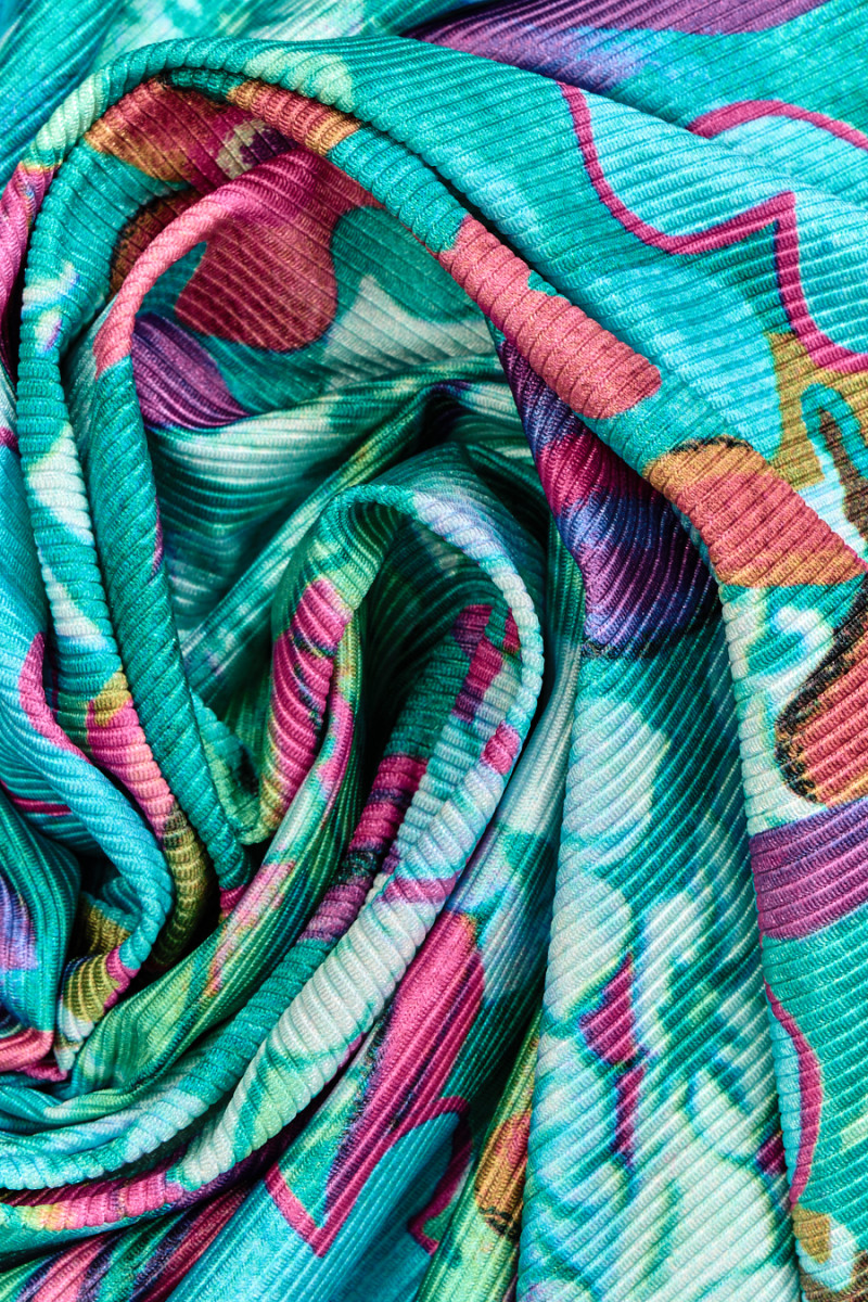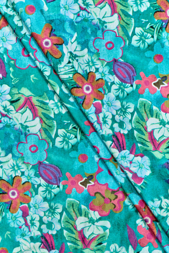 Polyesterstickat tyg med färgglada blommor på en turkos bakgrund. Det stickade tyget är ogenomskinligt, medeltjockt, böljande och räfflat. Det täta, blommiga mönstret i energiska färger är perfekt för sommarkläder som klänningar, blusar, tunikor, byxor och shorts.