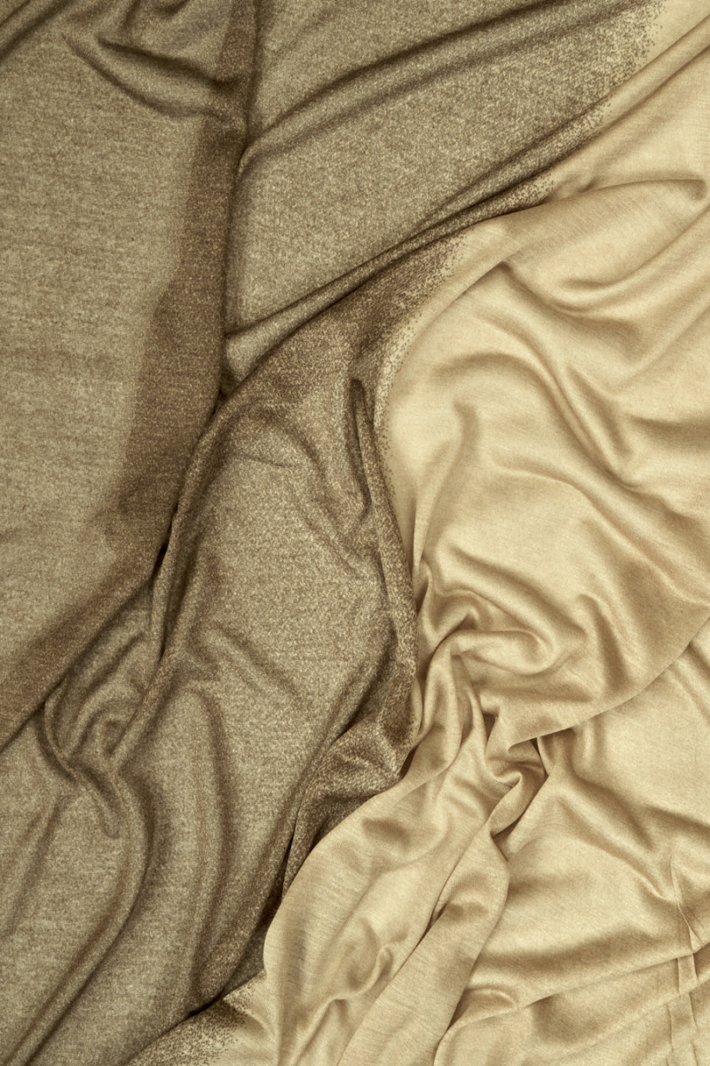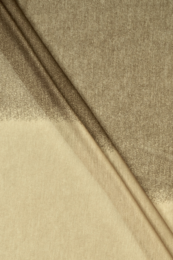 Italienskt viskosstickat tyg skuggat i beige och olivfärg. Det stickade tyget är något genomskinligt, tunt, mjukt, behagligt att ta på och elastiskt. Material avsett för blusar, T-shirts, t-shirts.