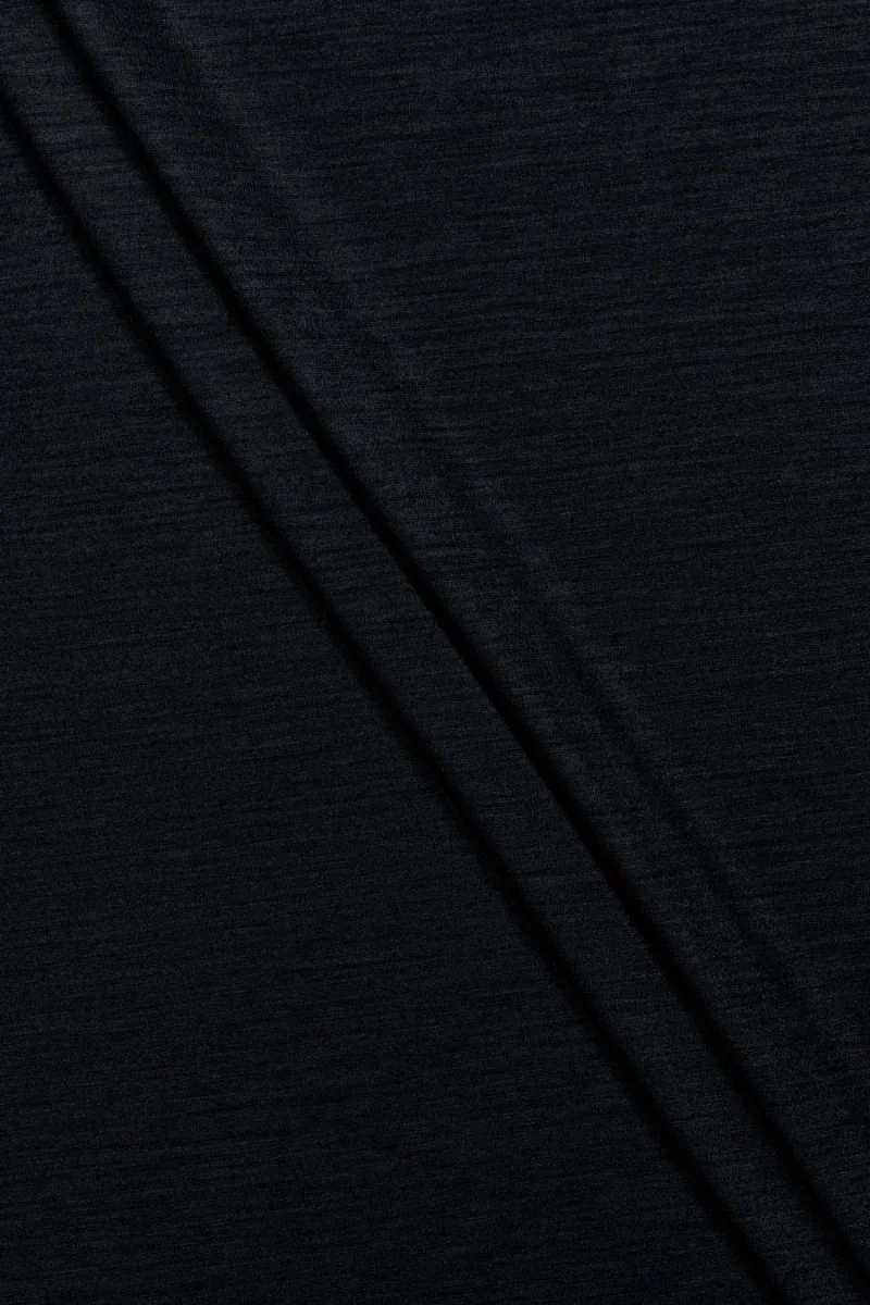 Italienskt stickat tyg vävt av ull och polyamid i blank svart. Det stickade tyget är av medeltjocklek, mjukt, elastiskt och har en glans. Vi rekommenderar den för blusar, toppar, T-shirts och lätta tröjor.