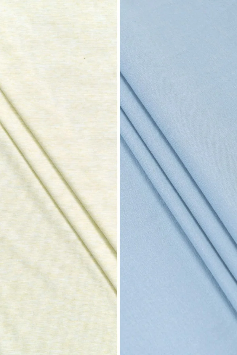 Italienskt stickat tyg i 100% viskos i två färger - blått och ljust, melerad limenyans. Det stickade tyget är tunt men ogenomskinligt, mjukt, elastiskt och matt. Vi rekommenderar det främst för blusar, toppar, T-shirts, det kommer också att fungera bra för klänningar och kjolar.