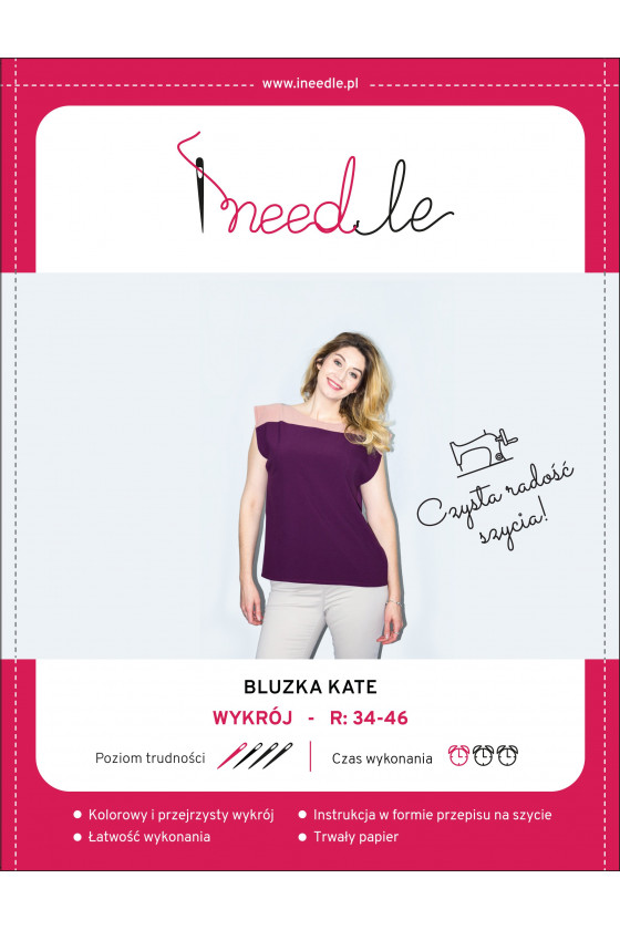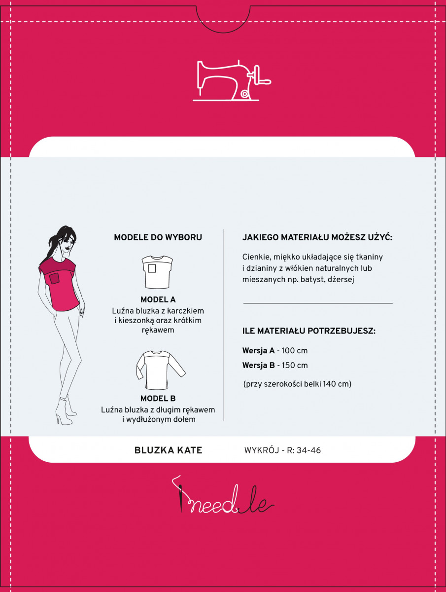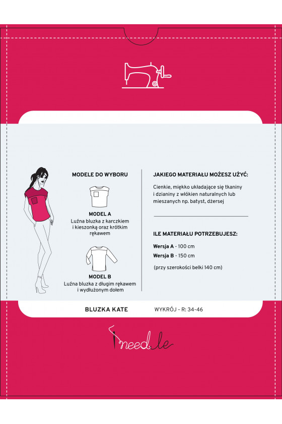 Det finns många möjligheter. Du kan tryggt kombinera enfärgat tyg med mönstrade tyger, vilket ger blusen en vardaglig eller mer elegant karaktär. Mönstret för Kate-blusen gör att du kan sy den i storlekar från 34 till 46.