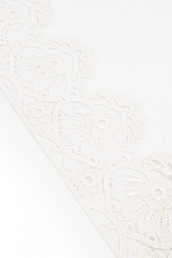 Italiensk guipuretejp i ecru färg. Ett vackert blommotiv på ett ljust tyllnät. Avslutas med en tand på ena sidan. Bredd: 20 cm.