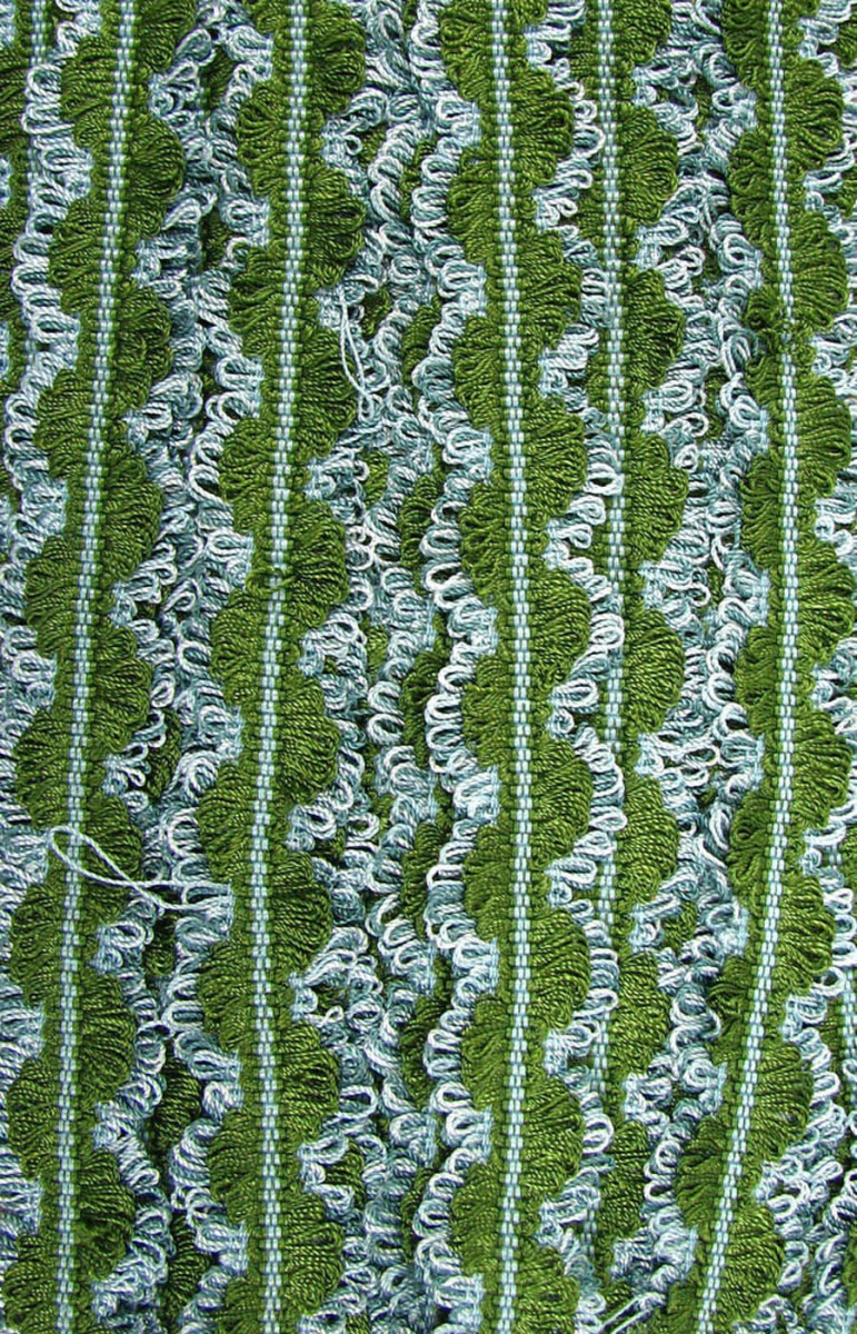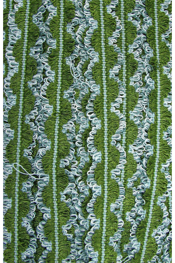 Sybehörstejp gjord av två sammanvävda snören – i grönt och ljusblått.