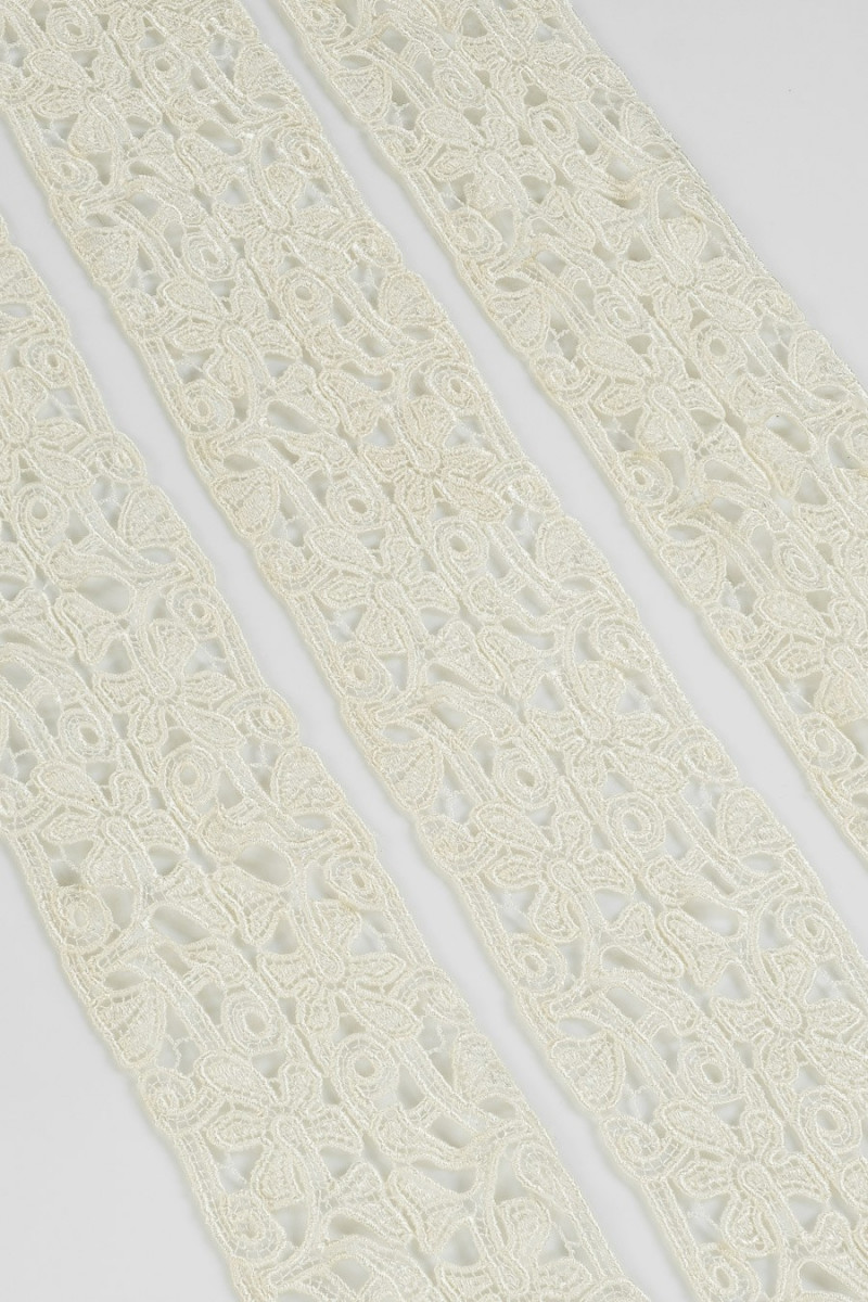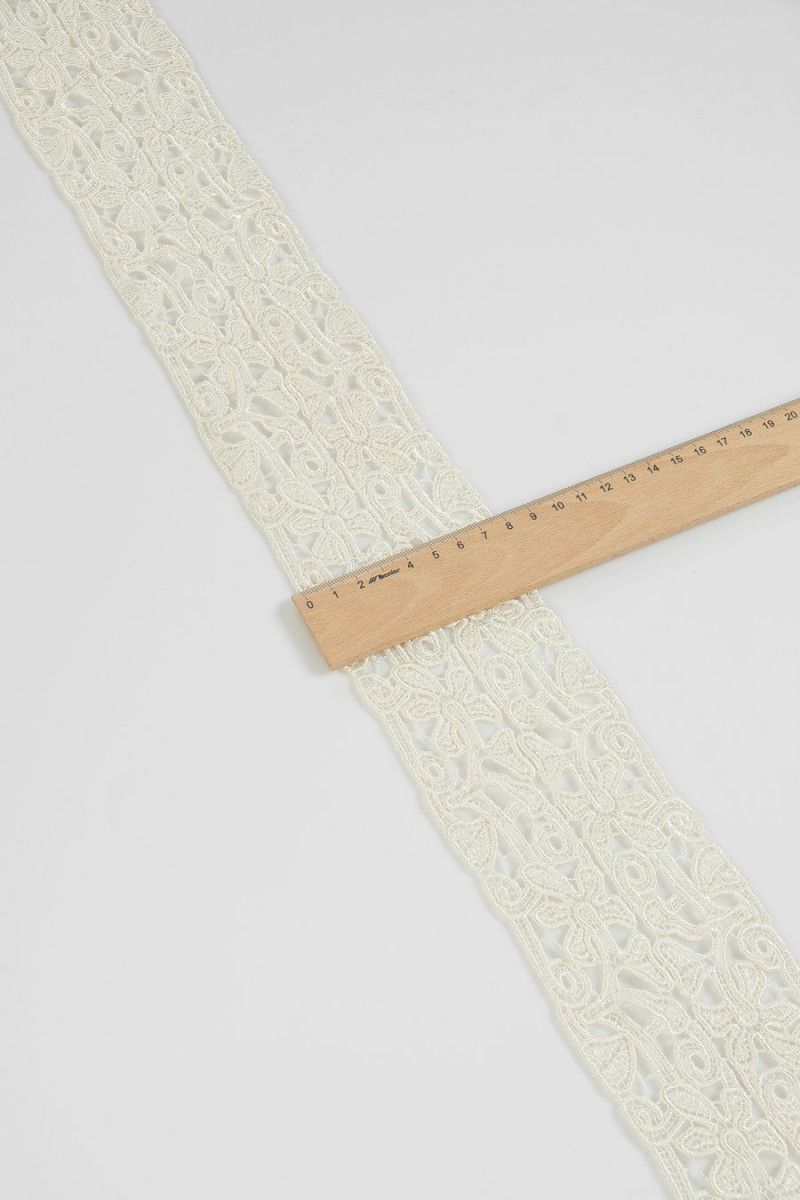 Sybehörstejp av guipurespets, ca 10 cm bred. Syfte: efterbehandling av klänningar, bröllopsklänningar.