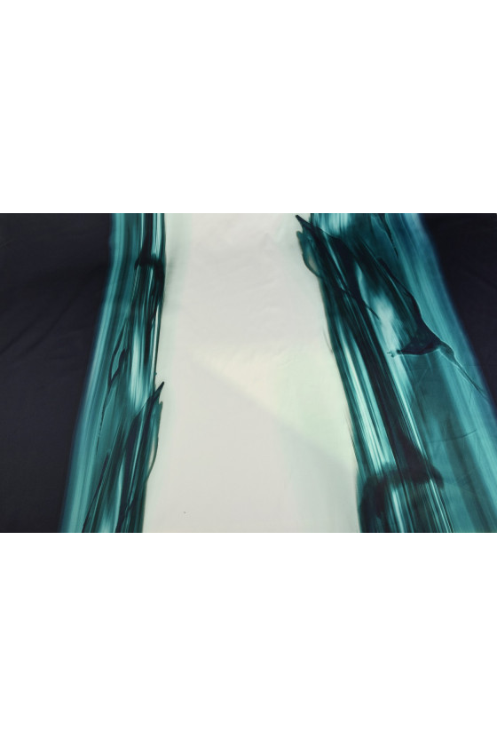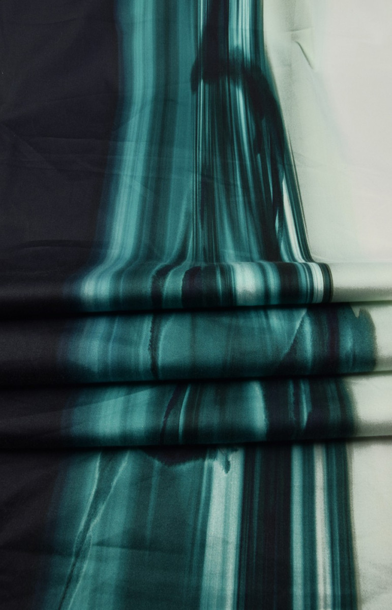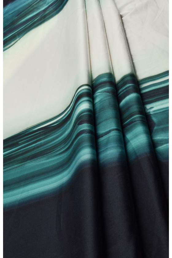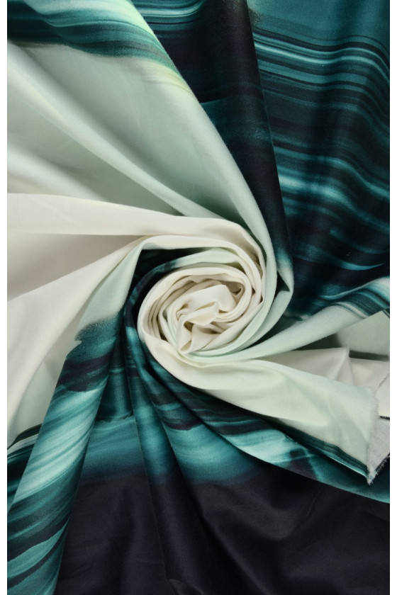 Tjockare bomull med elastan med oregelbundna ränder i följande färger: mörk marinblå, havsgrön och mycket ljus mint. Mot bakgrund av havets grönska, suddiga silhuetter av delfiner.