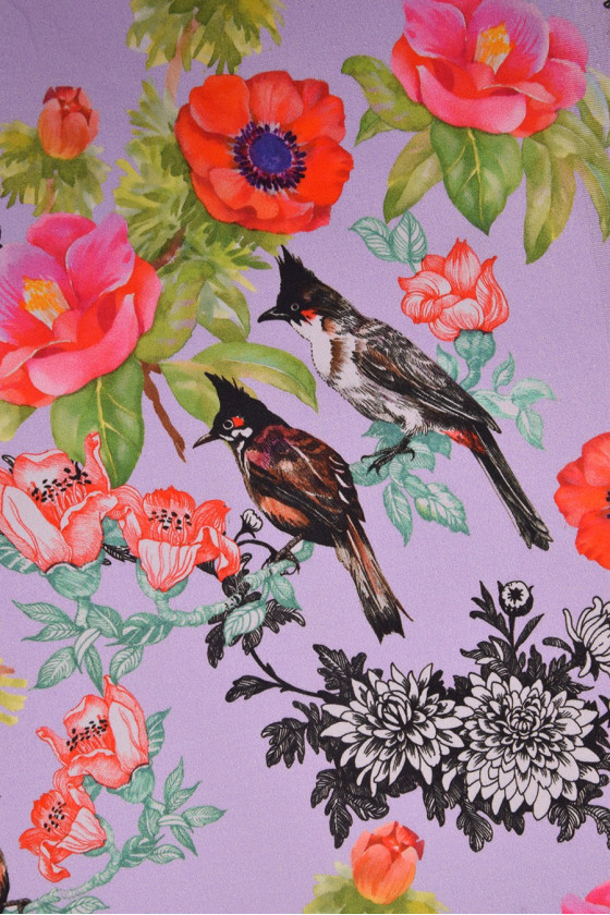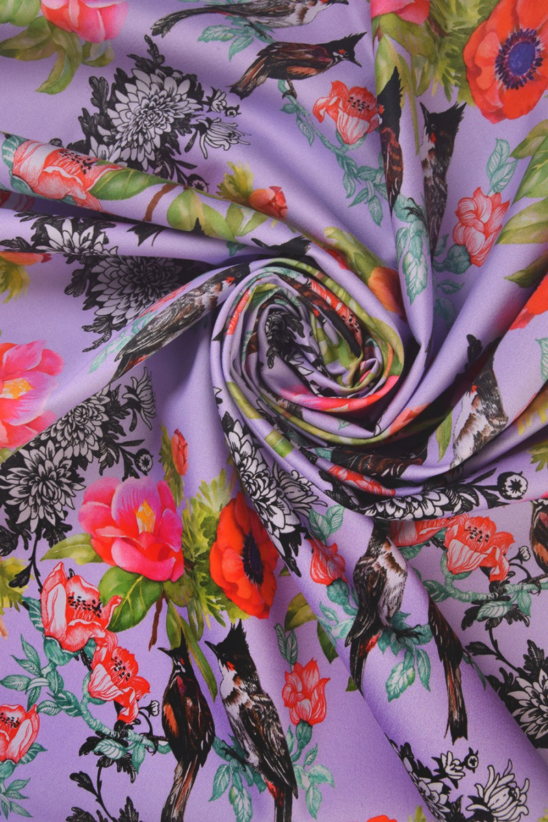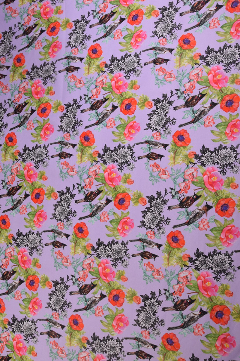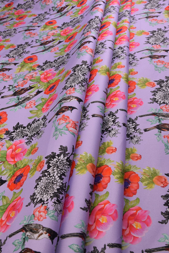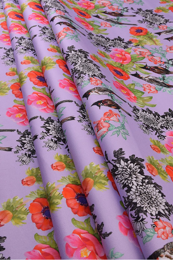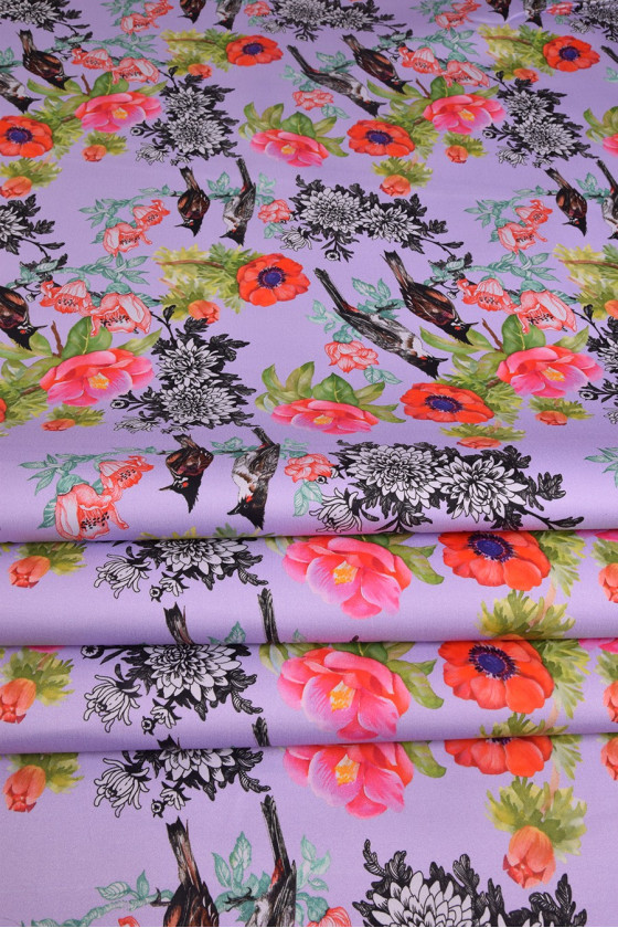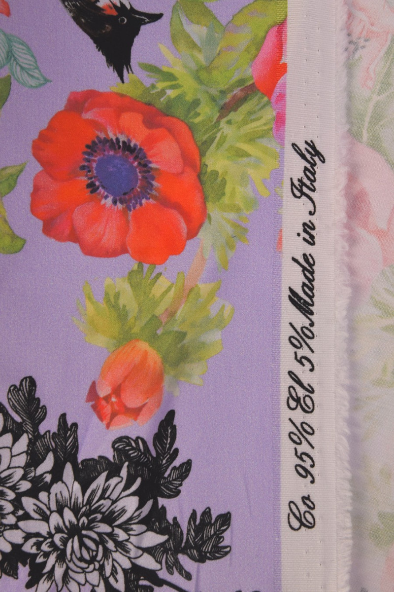 Italiensk bomull, av mycket god kvalitet, elastisk. På en ljuslila bakgrund finns färgglada blommor med fåglar (ca 8 cm stora). Vi rekommenderar den för att sy klänningar och kjolar. Byxor, jackor