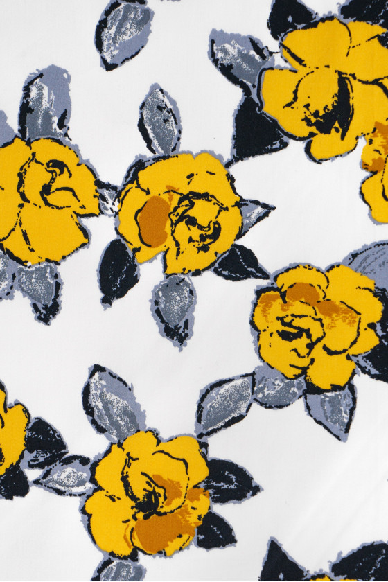 Italienskt bomullstyg med ett motiv av gula och svarta blommor på vit bakgrund. Tyget är tjockare, något styvt, elastiskt.