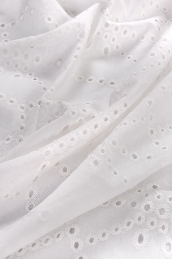 Italienskt tyg i 100 % bomull med écru Richelieu-broderi. Geometriskt motiv - kuber (16 cm) och kors. Tyget är tunt, lätt genomskinligt, inte elastiskt.