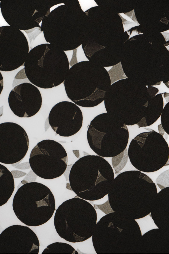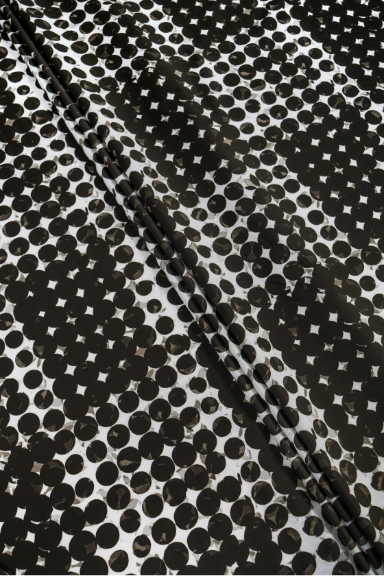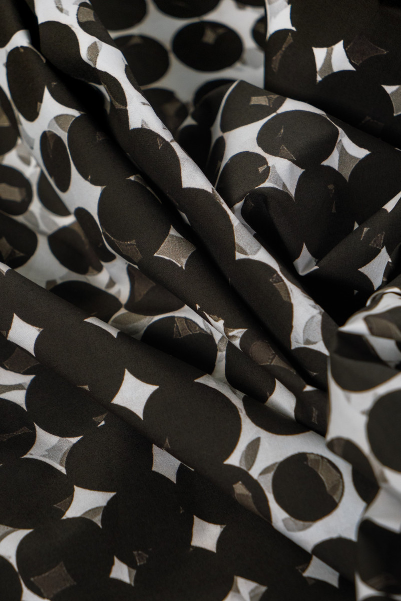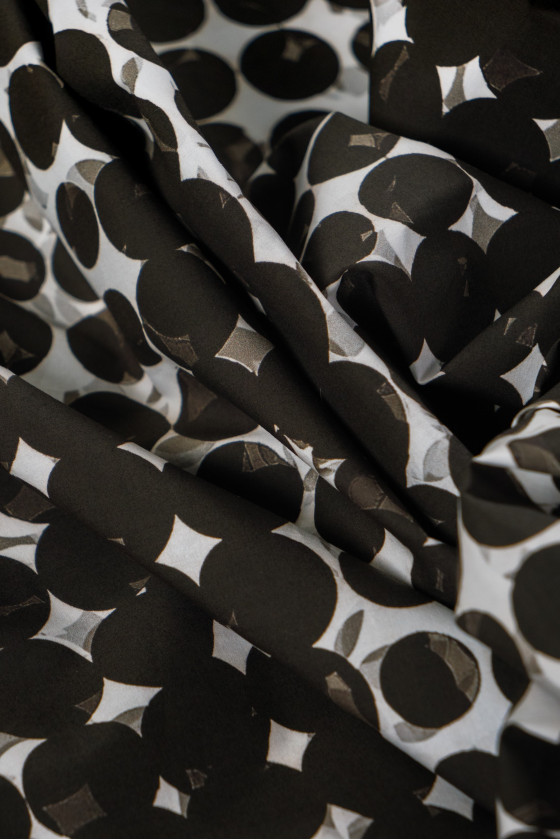Italienskt 100% bomullstyg i ecru-färg med ett motiv av svarta och grå geometriska mönster. Bomull är en 100% naturlig fiber. Bomullstyger är slitstarka, slits inte ut snabbt, behåller sina egenskaper under lång tid, är perfekt andningsbara, andas, vilket ger hög användarkomfort. Icke-elastiskt, matt, ogenomskinligt tyg - perfekt för att sy en klänning, skjorta, kjol eller shorts.