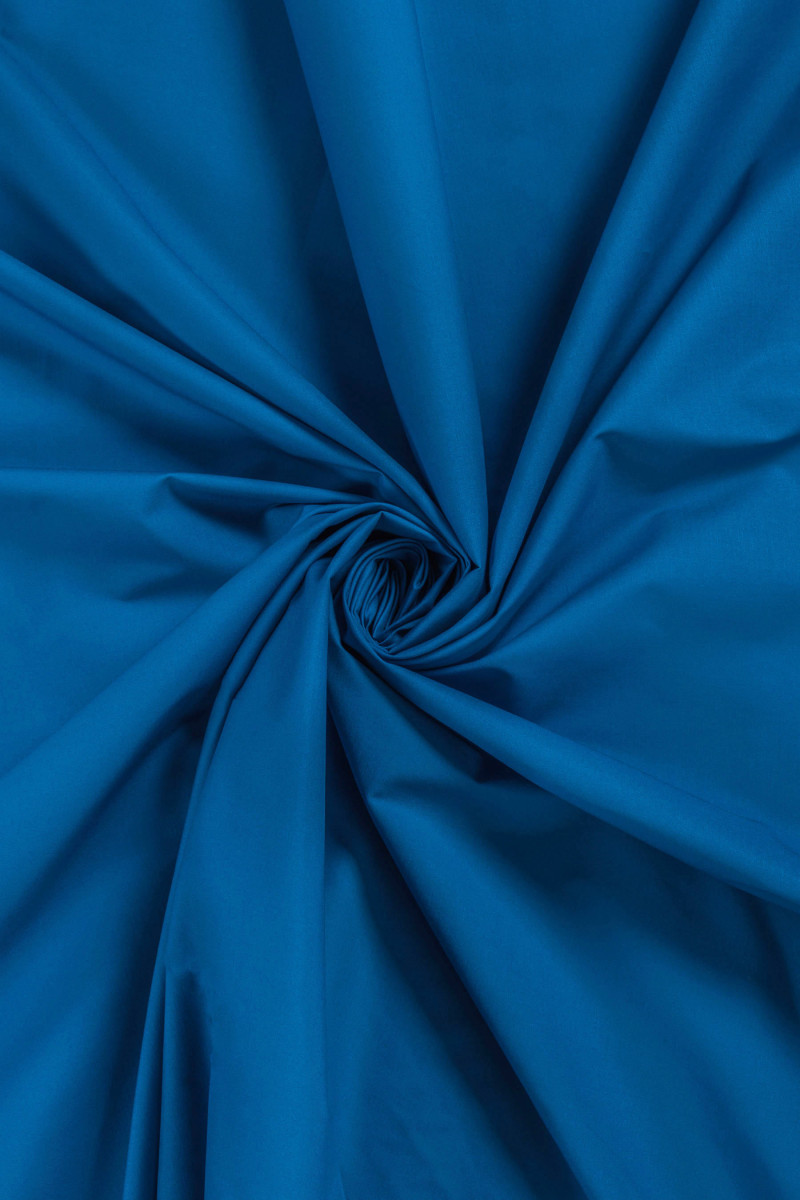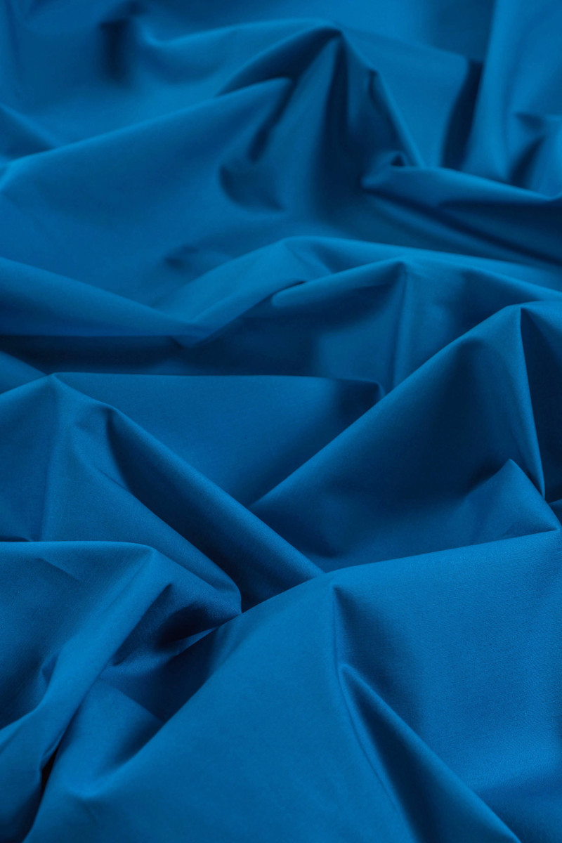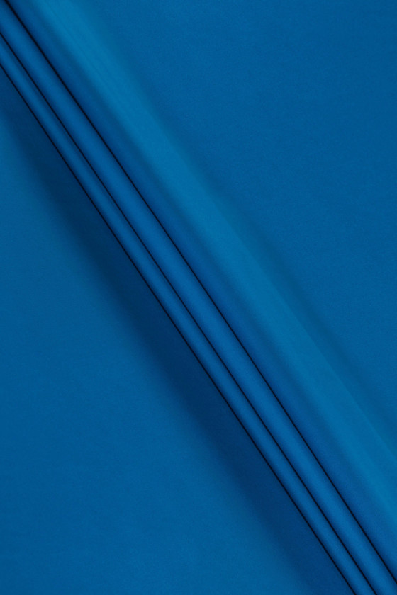 Italienskt bomullstyg med tillsats av elastan i blått. Ett elastiskt tyg av medeltjocklek och en slät, lätt glänsande väv avsedd för att sy en klänning, kjol eller byxor. Naturligt tyg av mycket god kvalitet, tillsatsen av elastan gör det bekvämare att använda och rynkar mindre. Ett oersättligt tyg på våren och sommaren.