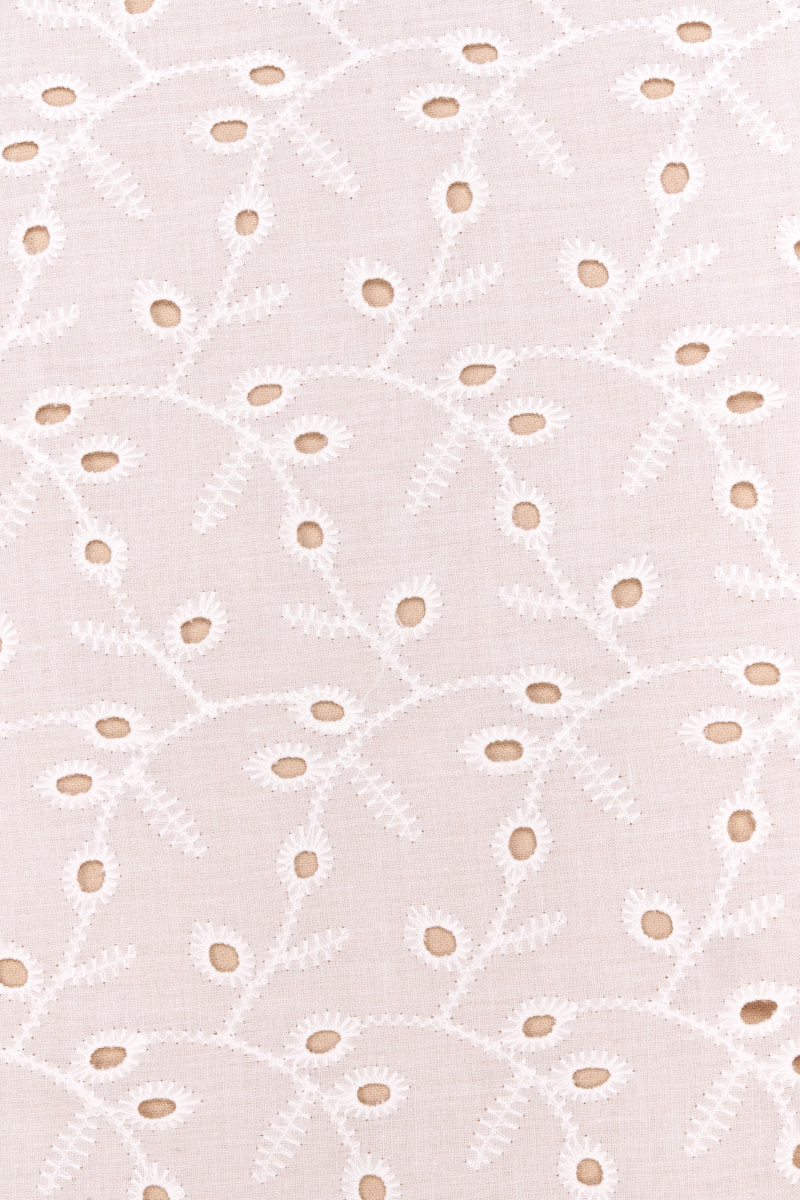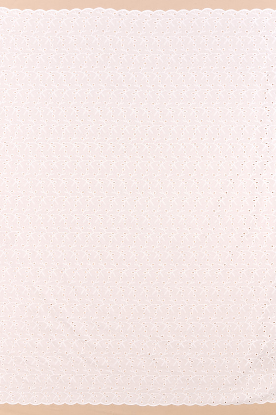 Italienskt tyg i 100% bomull med Richelieu-broderi i vitt. Motivet med små blommor arrangerade i kvistar, mönstret är regelbundet och tätt. Tyget är tunt, lätt transparent, icke-elastiskt, har snygg finish på båda kanterna. Ett underbart, lätt förslag för blusar, skjortor och klänningar.