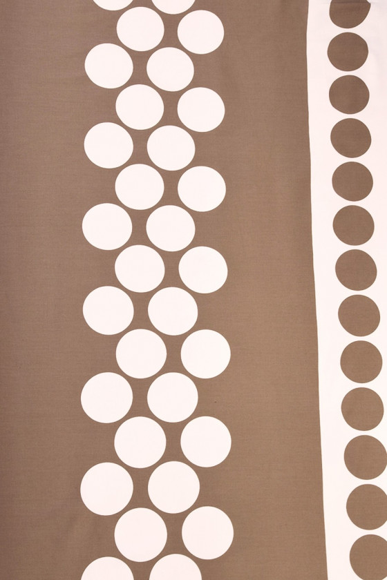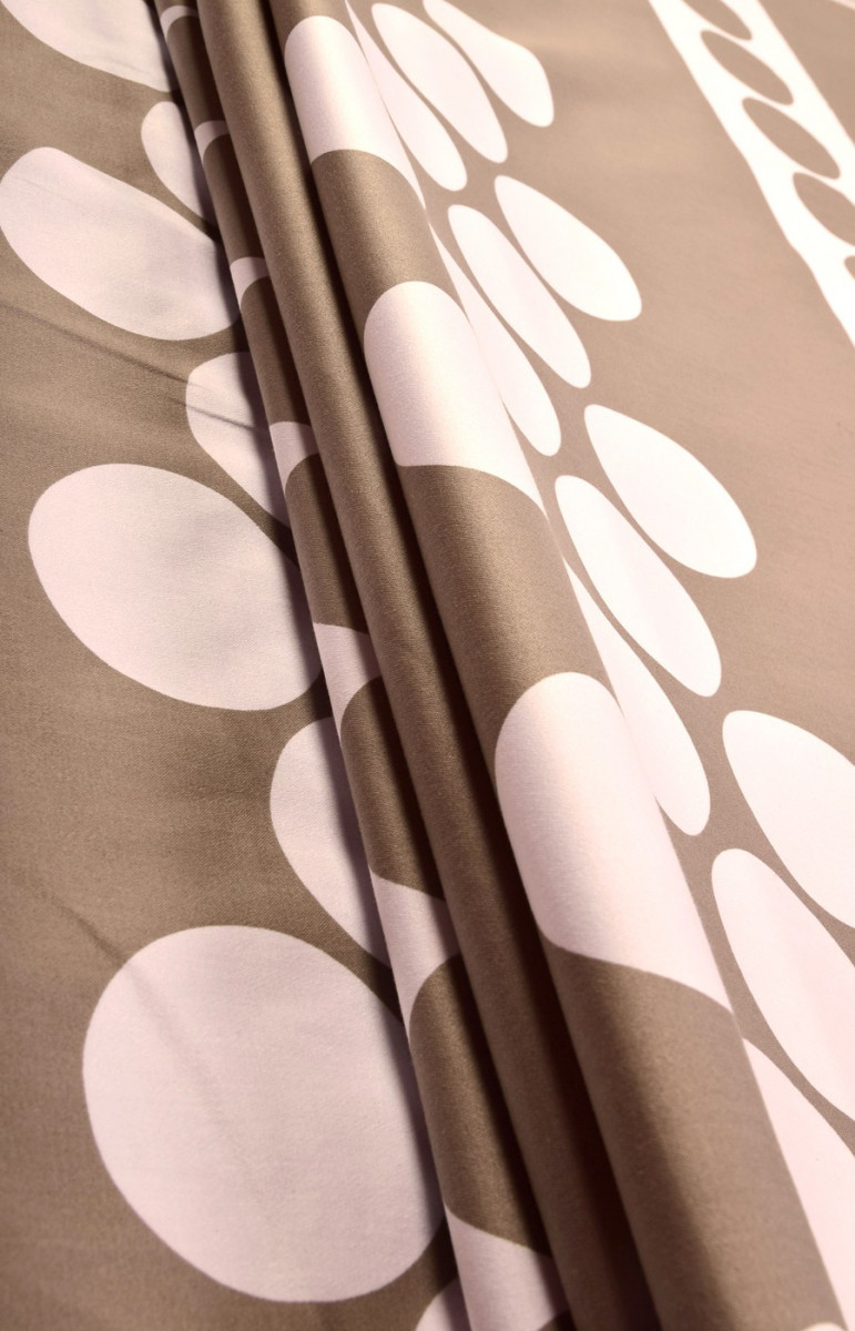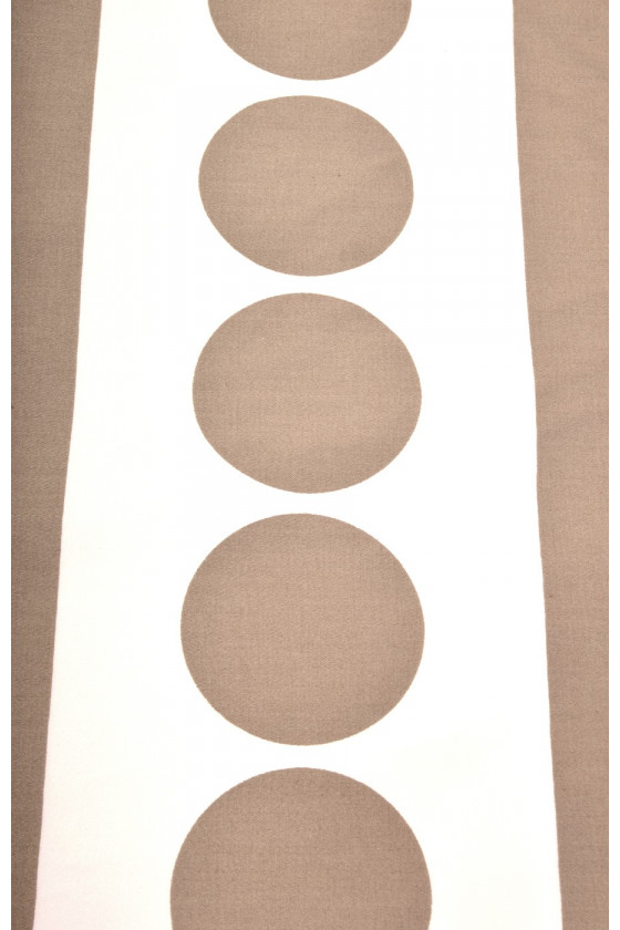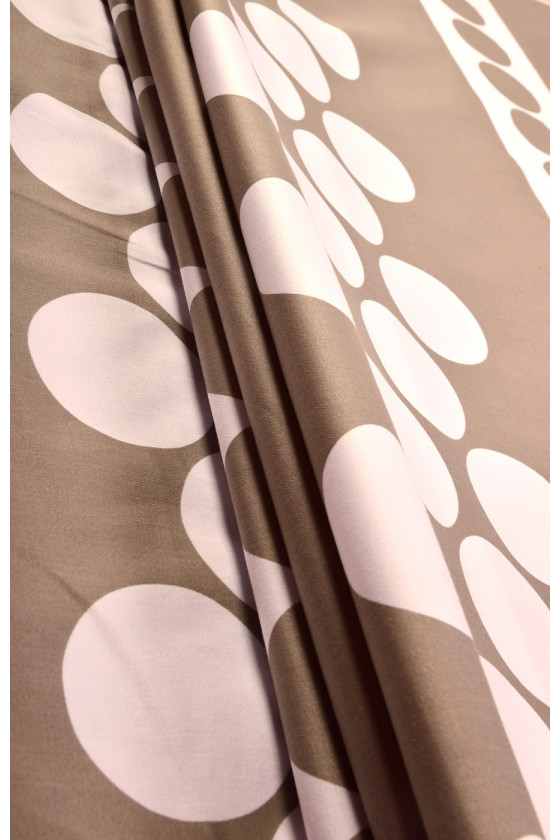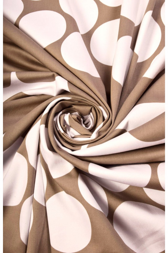 Tjockare naturlig bomull med elastan i en kupong 150*60 cm, det nedre midjebandet - beige cirklar (7,5 cm) på vit bakgrund är 14 cm. Vi rekommenderar den för att sy sommarkjolar, shorts, klänningar. Färger: vit och stenbeige.
