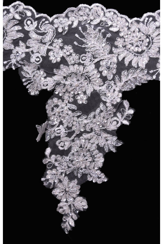 Cremefärgat spetsband broderat med stenar och paljetter. Tyg som avslutas på ena sidan med en tand. Perfekt för att avsluta bröllopsklänningar.