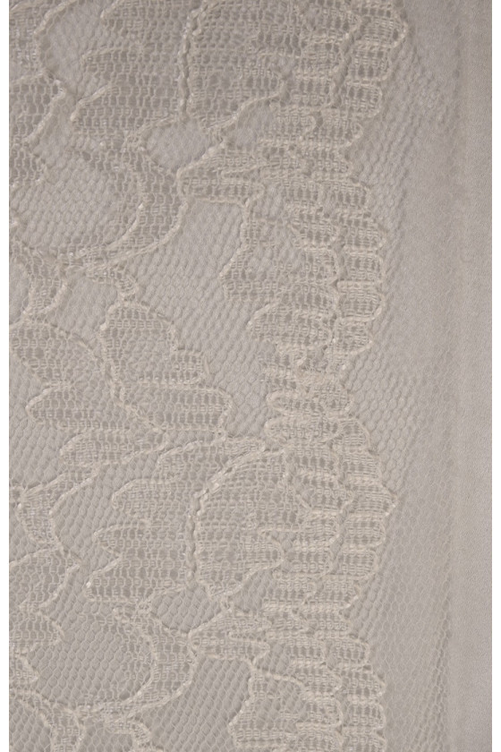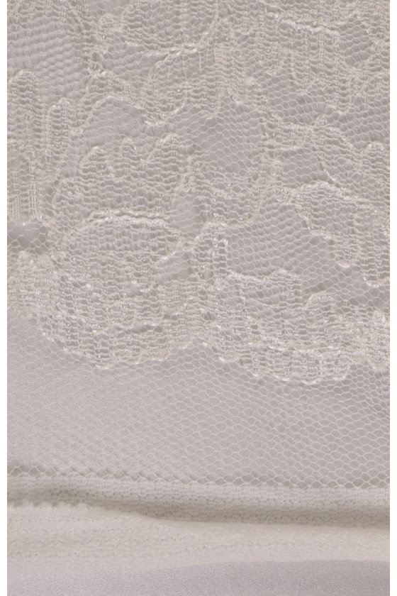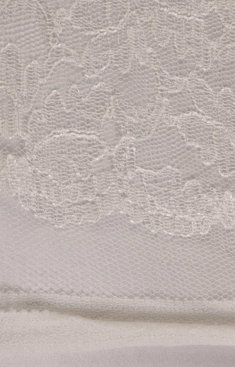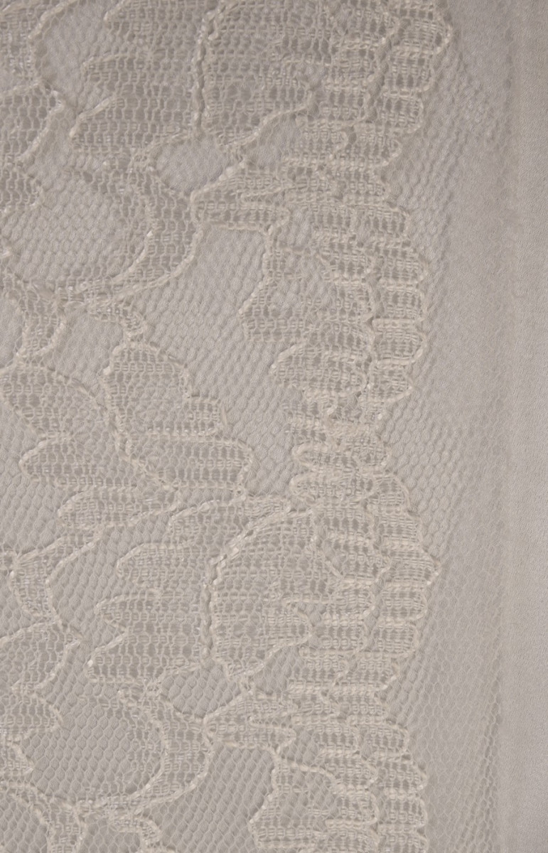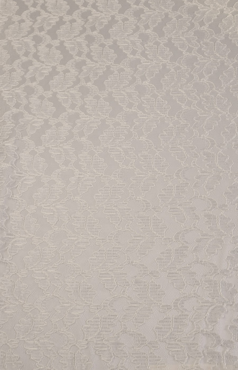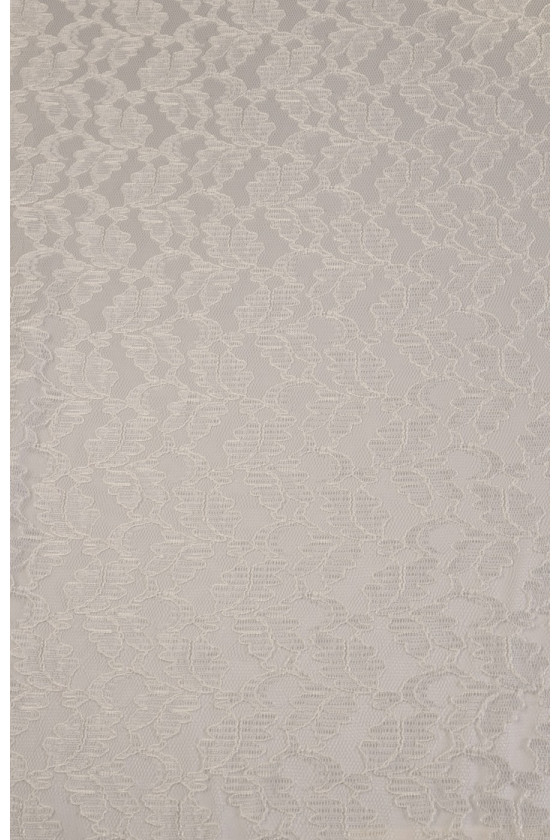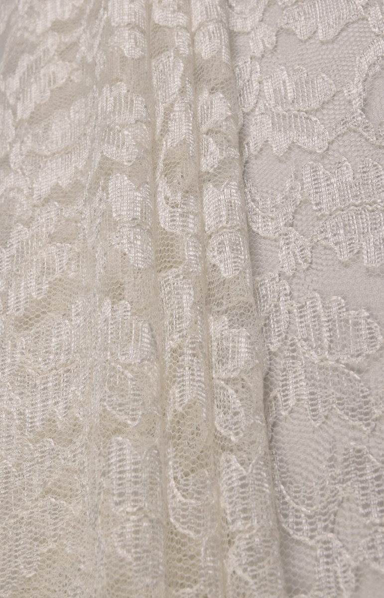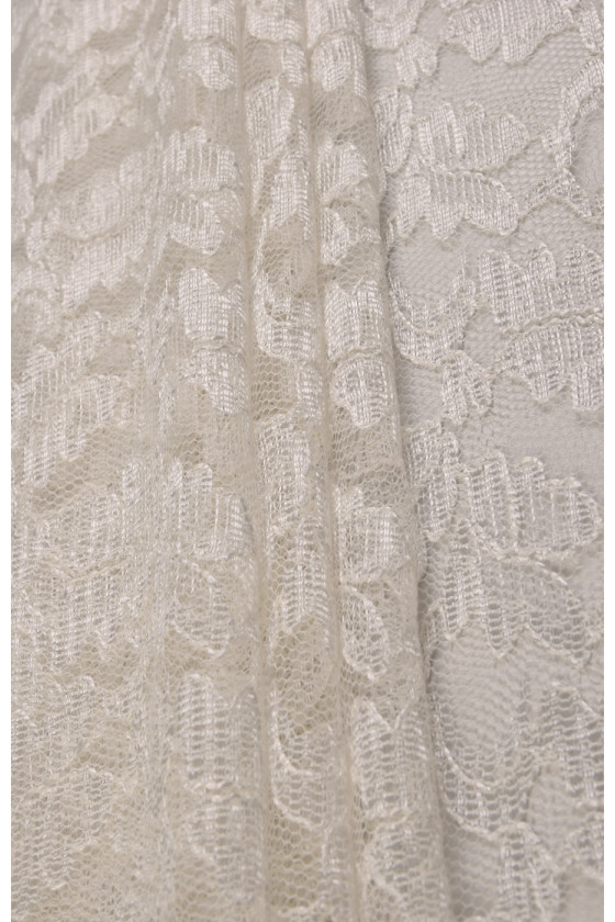Bröllopsspets med ett tätt ecru-mönster är inte färdig med en dekorativ tand. Spetsen är delikat, mjuk vid beröring, sitter bra.