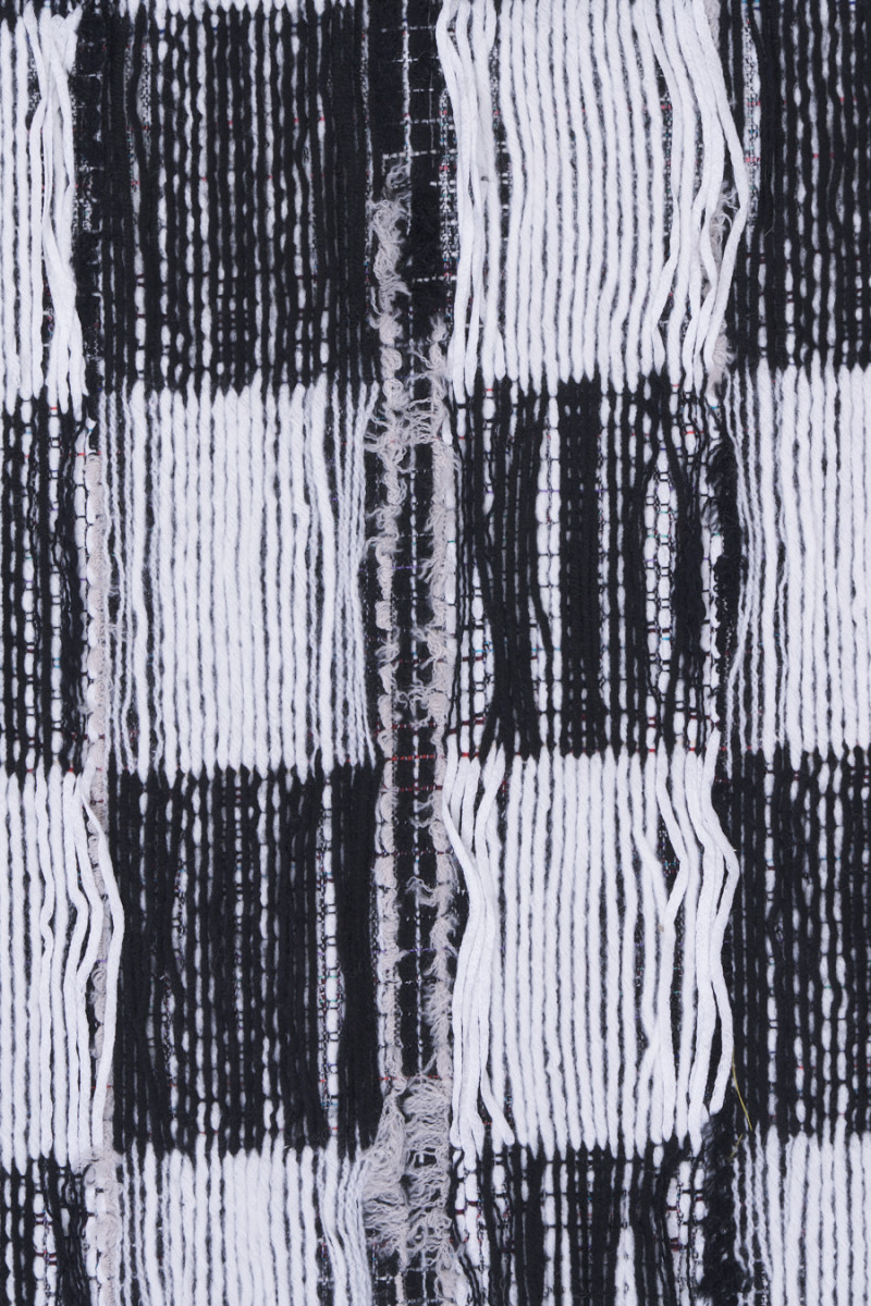 Italiensk chanel kostymtyg i svart med ecru tråd. Ett tyg med konvex struktur och tät väv med ett rutigt motiv på +- 11 cm. Tyget har lösa sammanflätningar som kan klippas fritt, tack vare vilka vi kommer att uppnå effekten av fransar. Med den här proceduren kan du skapa enskilda projekt enligt dina önskemål. Ett fantastiskt förslag för fans av tweedkläder i tidlösa färger och alltid moderiktiga mönster, och för människor som uppskattar unika kläder. I det här tyget är det bara fantasin som sätter gränser för dig själv - skapa något speciellt för dig själv.