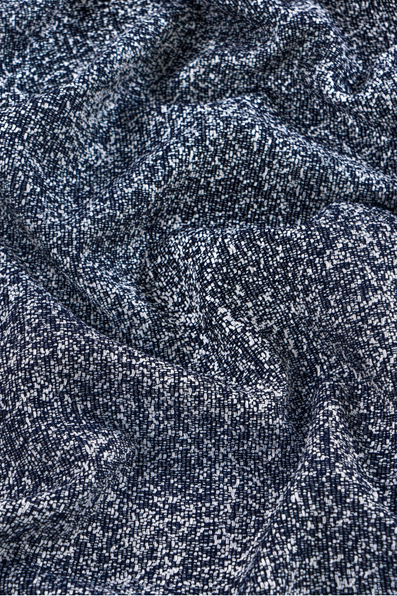 Italiensk chanel kostymtyg i vitt och marinblått. Chanel-tyget är ett mycket elegant, mjukt och köttigt tyg, känt för sin originella väv. Perfekt för att sy en kostym, jacka, jacka, kjol eller tunn kappa.