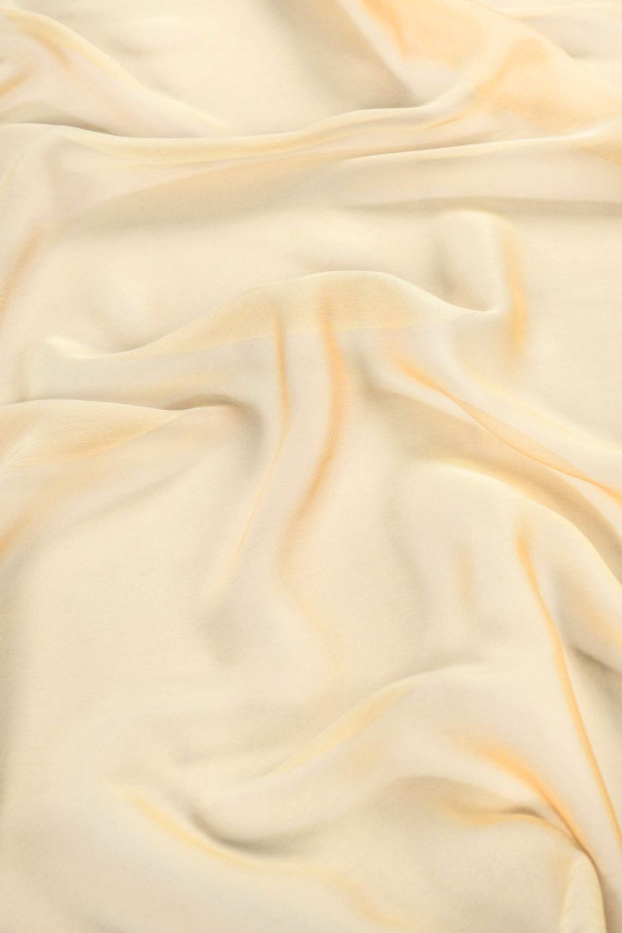 Italienskt chiffongpolyestertyg med en intressant väv av två färger av trådar - ljusorange och vitt, vilket skapar en tvåfärgad effekt. Tyget är mycket delikat, luftigt, transparent och icke-elastiskt. Perfekt för luftiga klänningar, kjolar och blusar, du kan också sy en vacker halsduk av den.