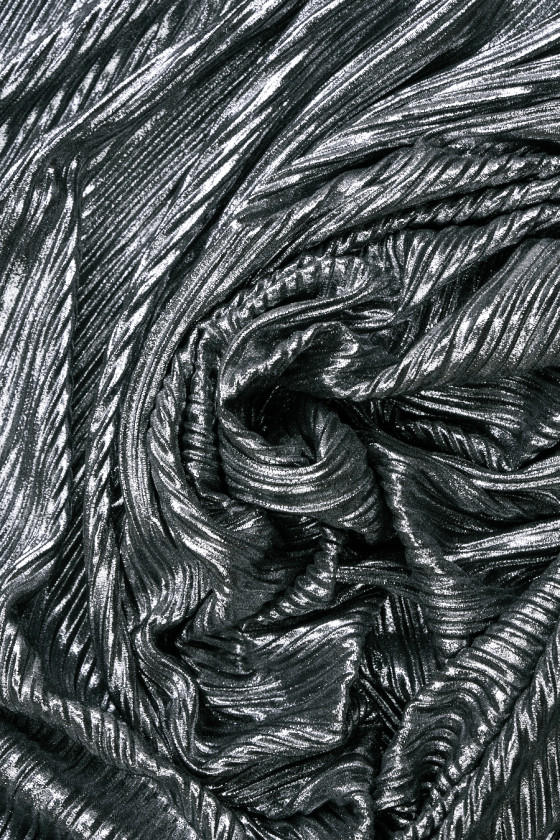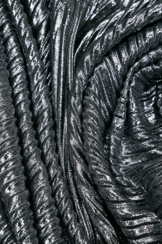 Effektfullt, glansigt tyg fint veckat i svart och silver.