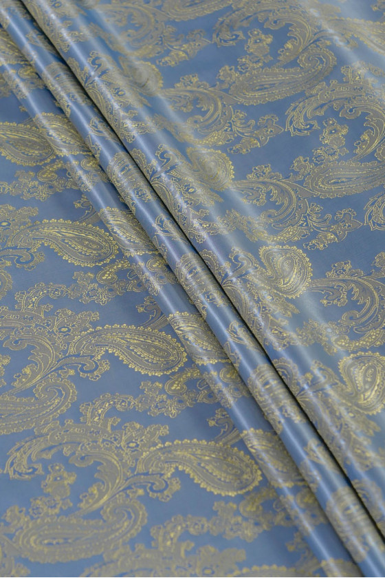 Italienskt jacquardfoder med orientaliskt motiv - gult och blått tvåfärgat. Tyget är icke-elastiskt, något blankt. Perfekt för att fodra kappor, jackor, västar, jackor.