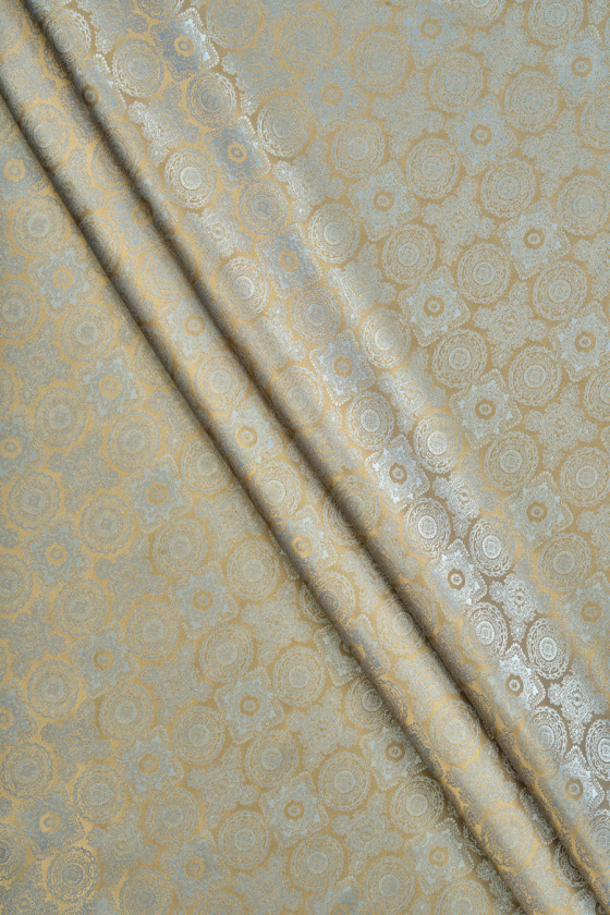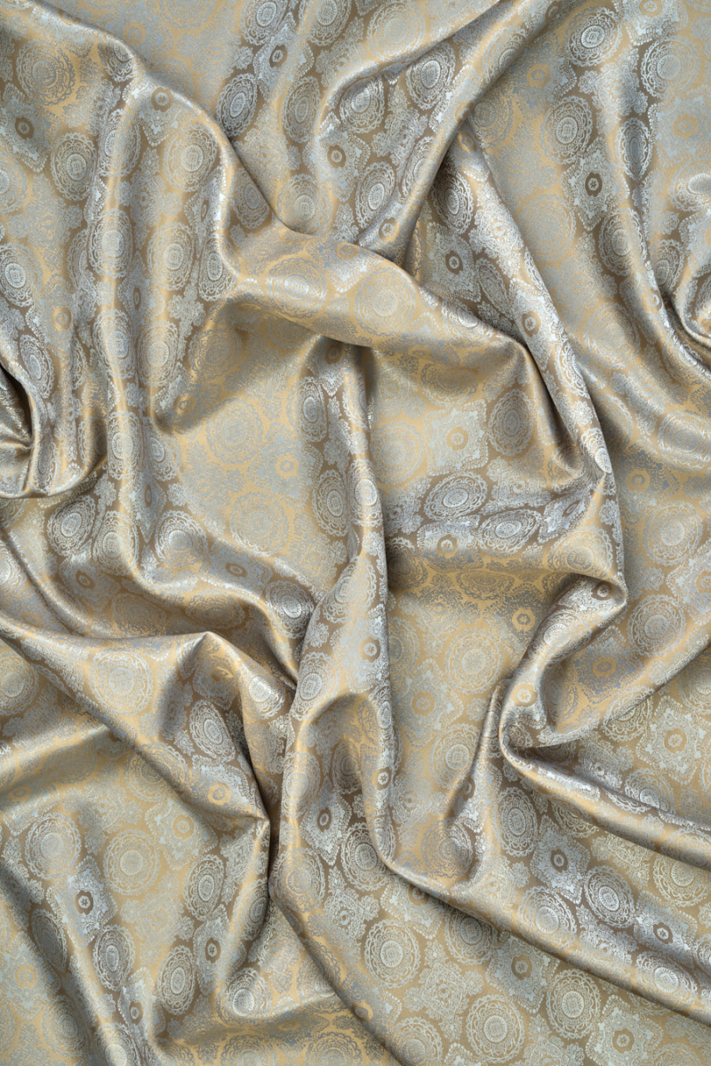 Italiensk jacquard tvåfärgat foder i guldgrått. Det mest fashionabla mönstret av orientaliska ornament. Tyget är oelastiskt, något glänsande. Perfekt för foder av rockar, jackor, västar, jackor.