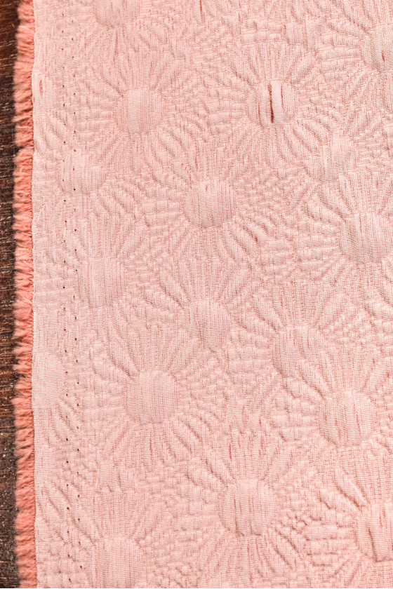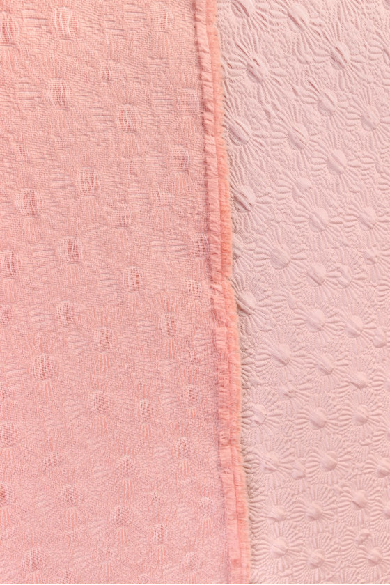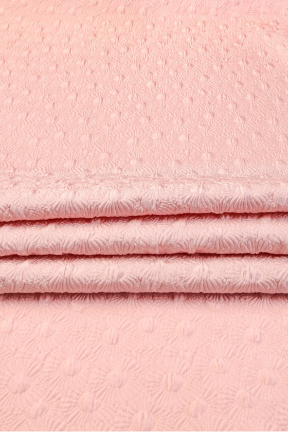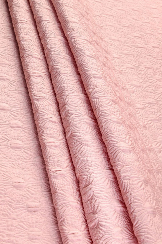 Italiensk jacquardkostym tyg i ljusrosa. Ett mycket originellt, präglat mönster av överlappande tusenskönablommor ca 4 cm i storlek. Det hela är gjort i en färg, vilket gör mönstret mycket subtilt och delikat. Tyget är medeltjockt, matt och något styvt. Den är perfekt för att sy en kostym, klänning, kappa eller för dekorativa ändamål.