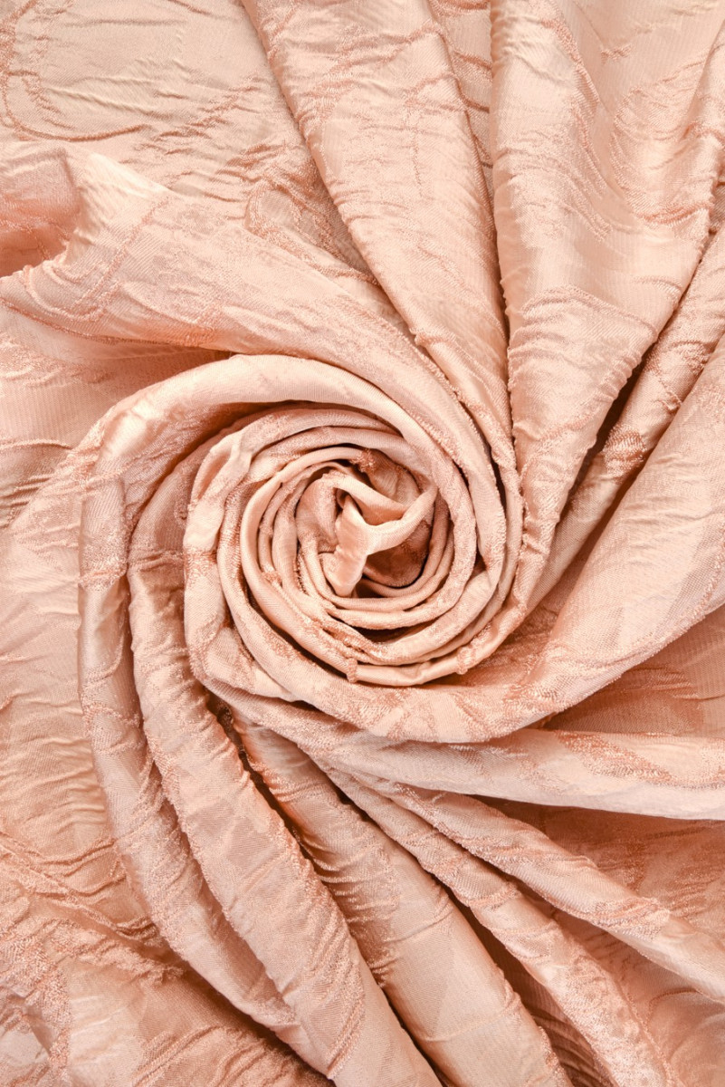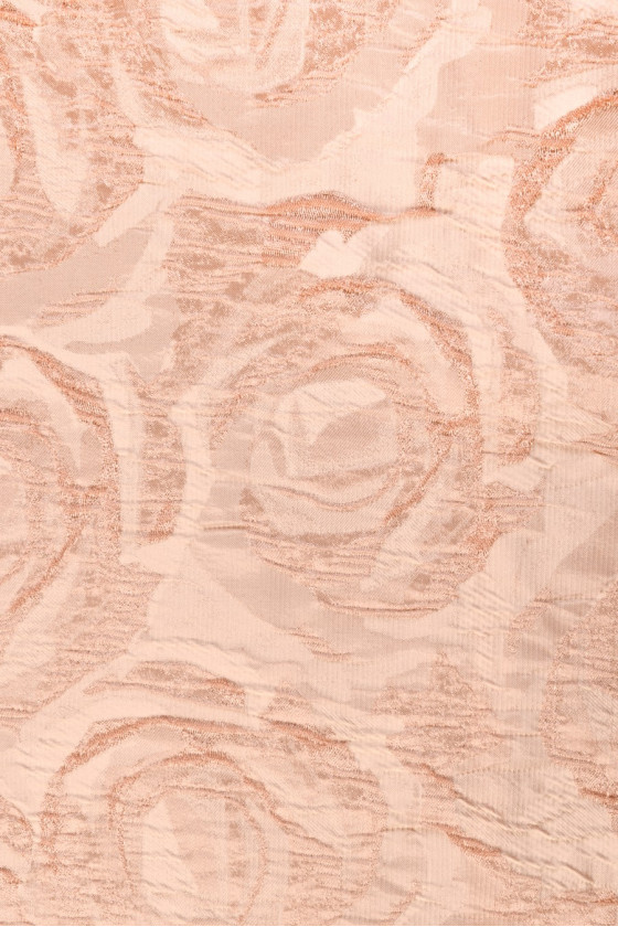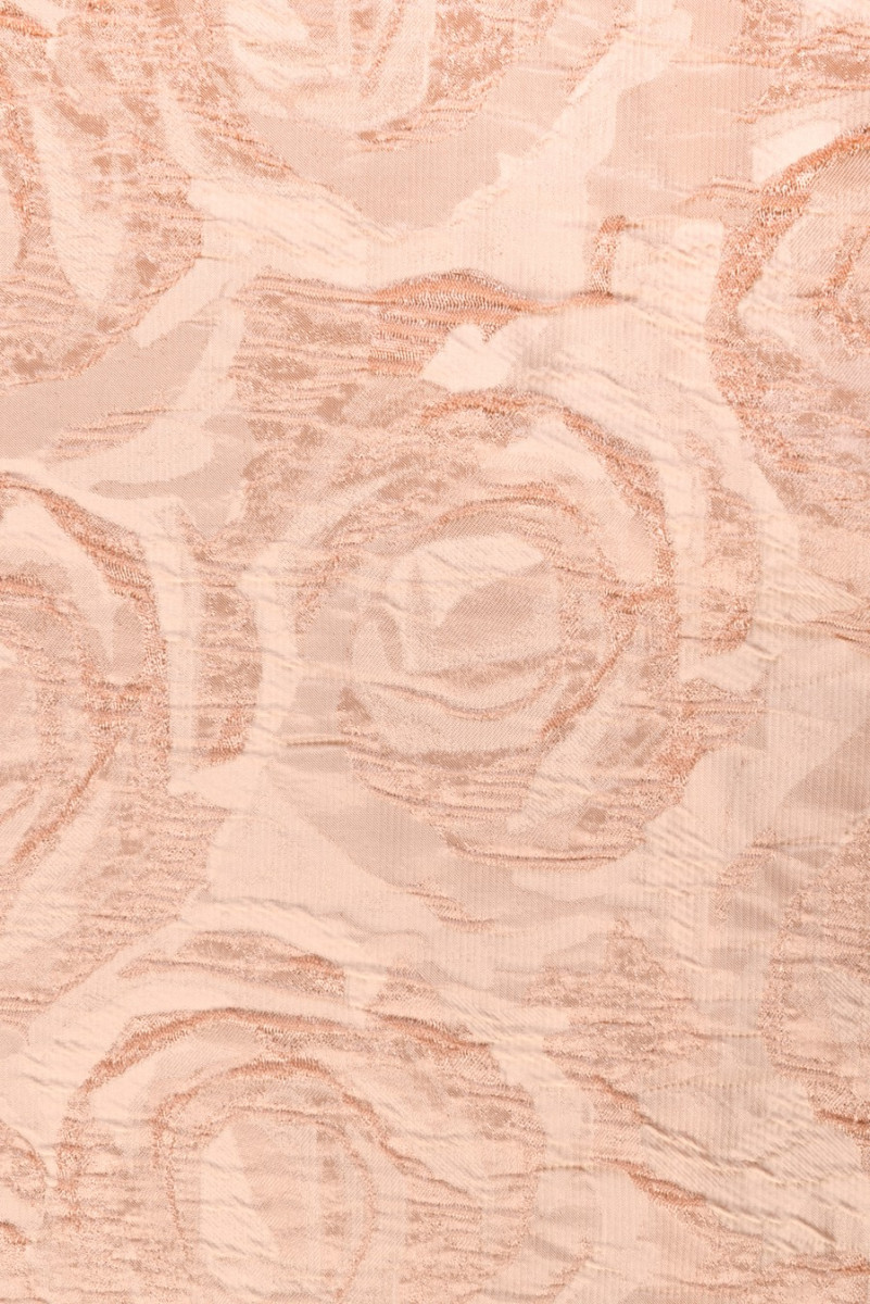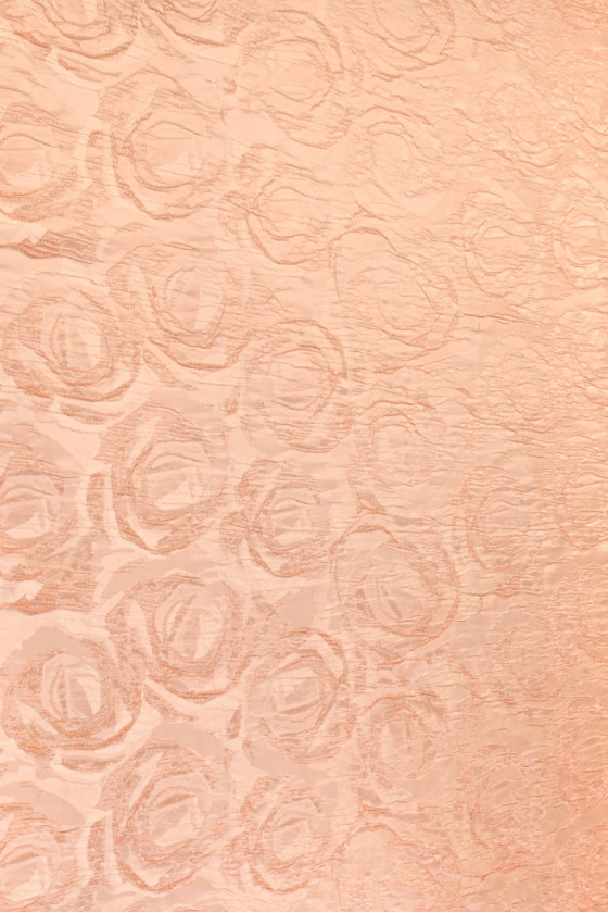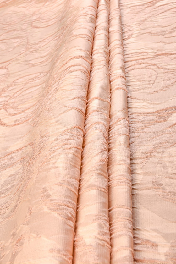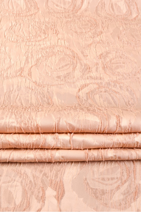 Italiensk jacquardkostym i beige och laxfärg. Det mycket slående mönstret av präglade rosblommor är gjort av en mörkare nyans än bakgrunden. Tyget är medeltjockt, oelastiskt och något styvt. Den är perfekt för att sy kläder för olika familjefester eller för dekorationer. Ett fantastiskt förslag för människor som gillar blommiga mönster i neutrala färger.