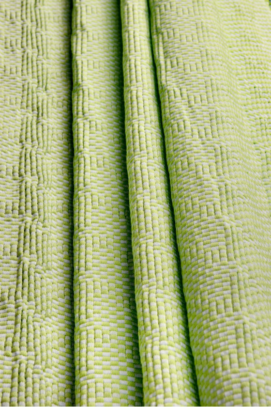 Italiensk jacquardkostym tyg med ett kycklingfotsmotiv ca 2 cm i storlek. Tyget kommer i krämgröna färger och har en mycket klar, tjock väv som ger det struktur. Tyget är tjockare, styvt, icke-elastiskt. Den har ett brett utbud av applikationer, inklusive. för att sy en kostym, kappa, men också som dekoration.